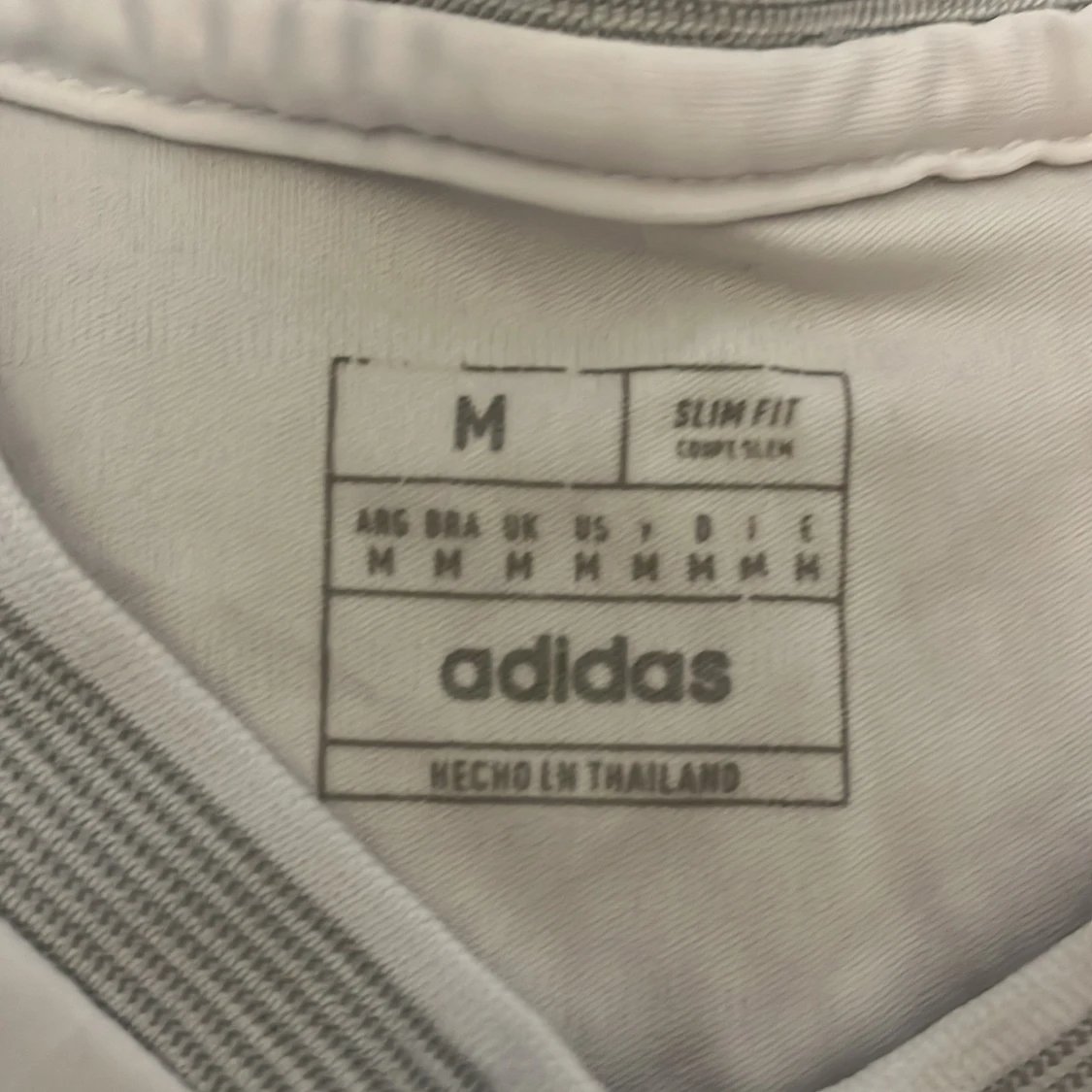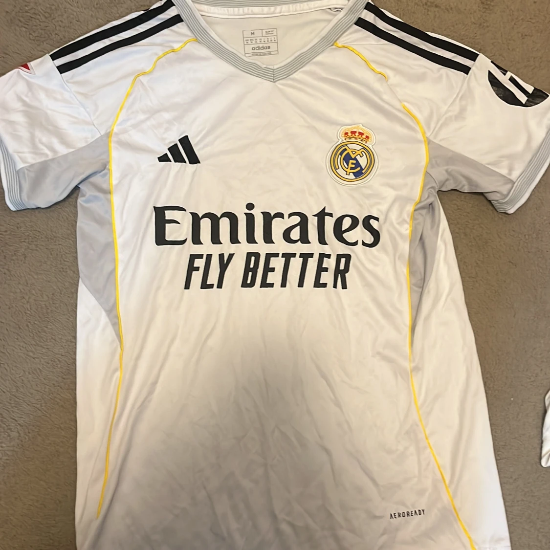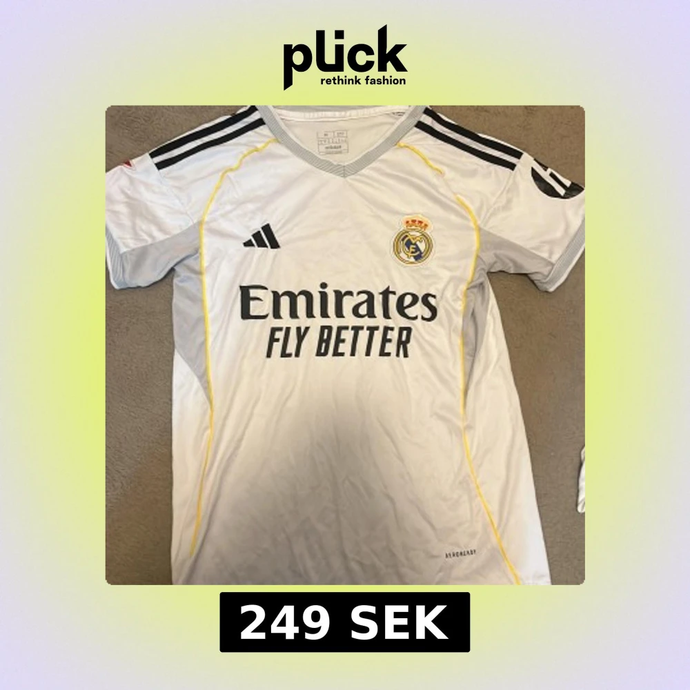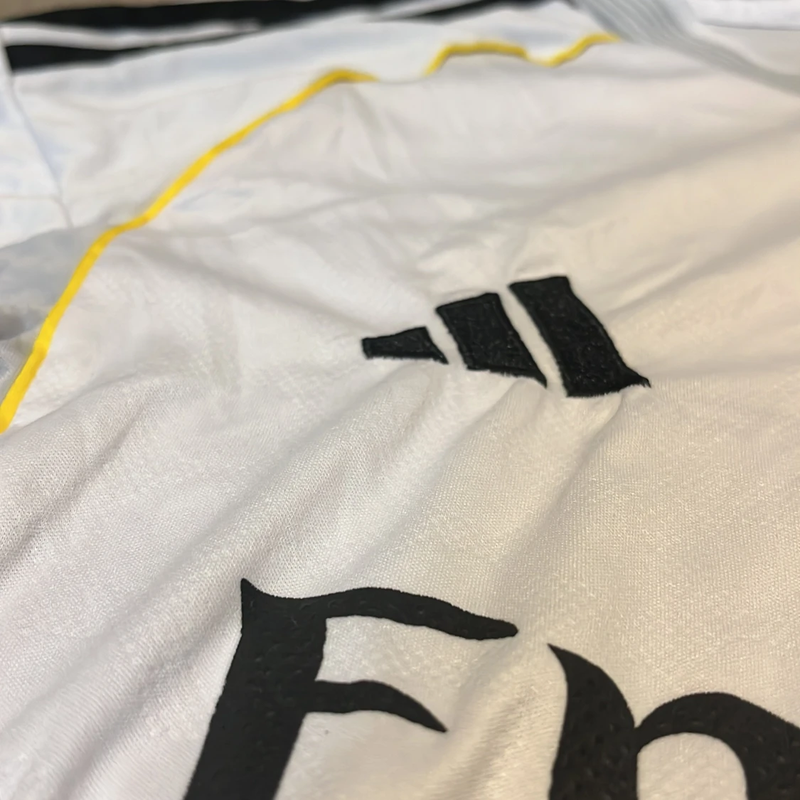 Snygg Real Madrid fotbollströja från Adidas i vitt med svarta detaljer och gula linjer. Tröjan har klubbmärke och sponsortryck på bröstet, klassiska Adidas-ränder på axlarna och är tillverkad i lätt, ventilerande material. Perfekt för dig som älskar fotboll och vill bära ditt lag.