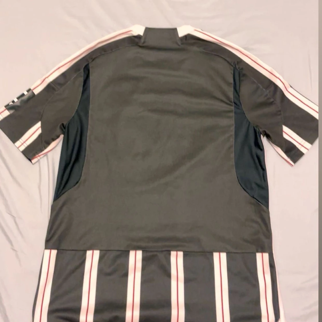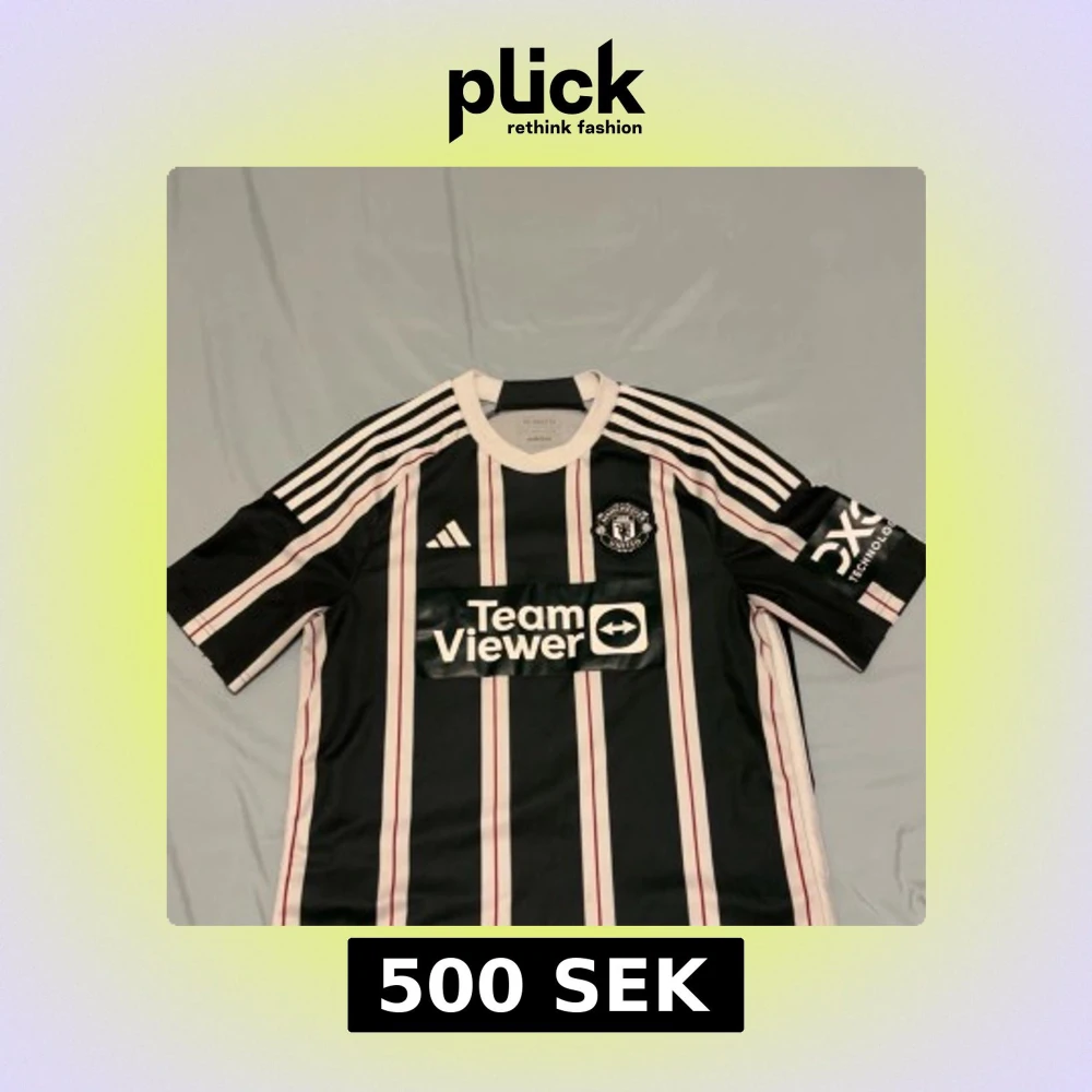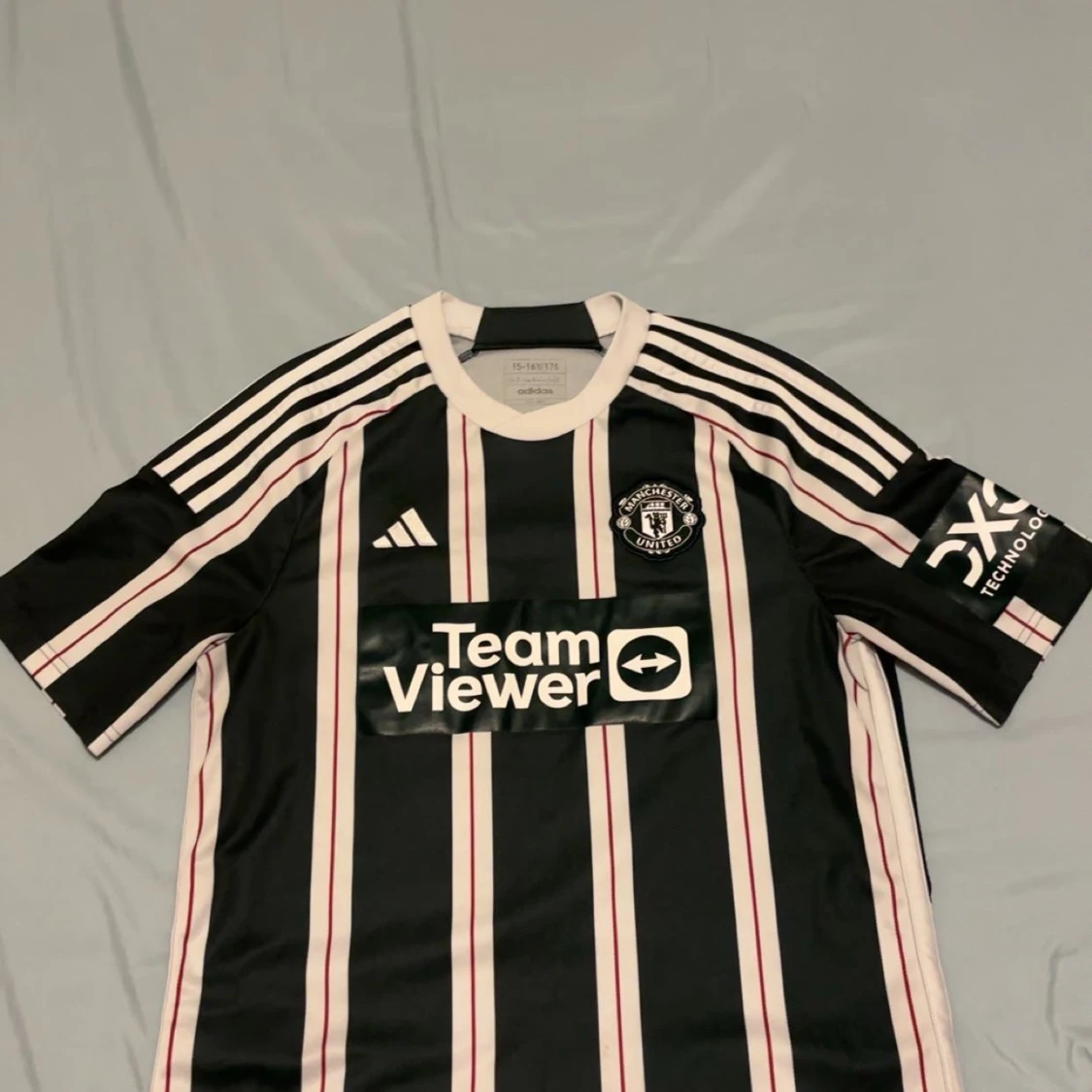 Snygg Manchester United fotbollströja från Adidas med svart och vit randigt mönster och röda detaljer. Kortärmad modell med klubbmärke på bröstet och TeamViewer sponsortryck. Tillverkad i lätt och ventilerande polyester, perfekt för match eller träning. Priset kan diskuteras.