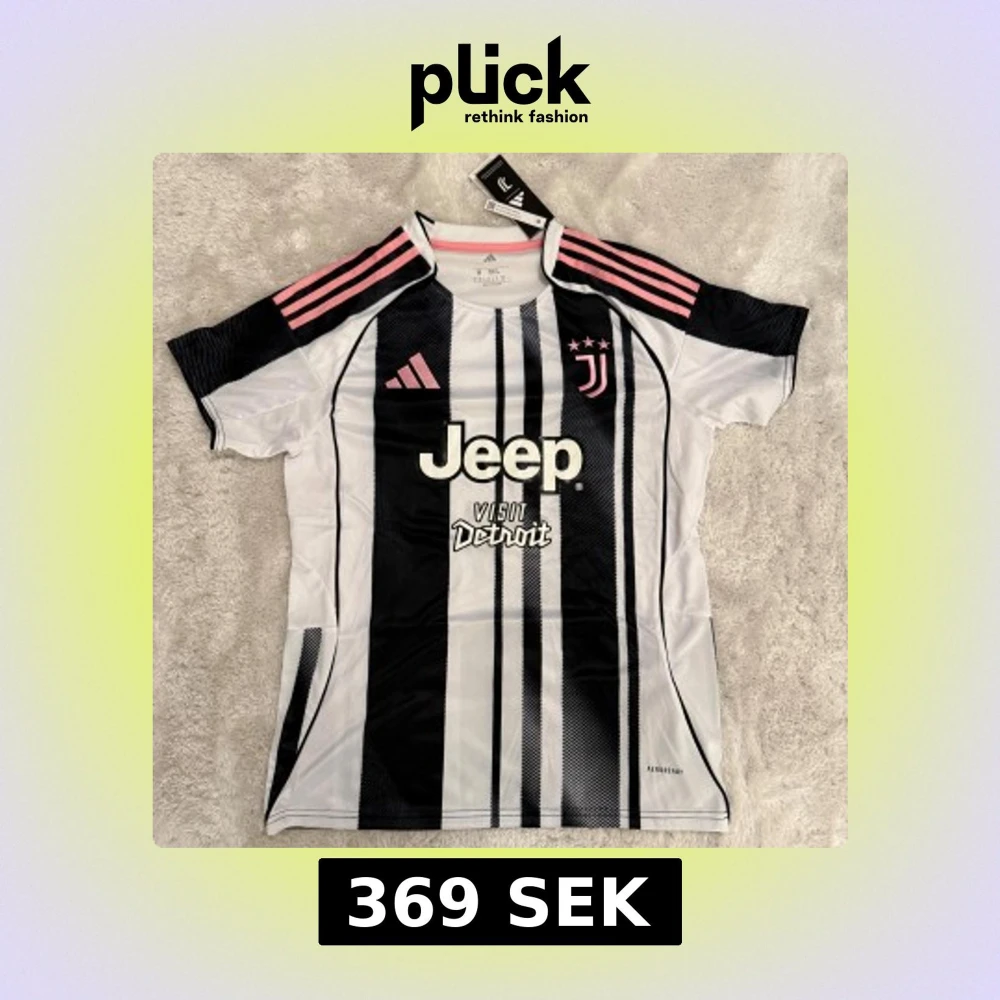 Juventus fotbollströja från Adidas med svartvita ränder och rosa detaljer på axlarna. Jeep-logga på bröstet och tre rosa stjärnor vid klubbmärket. Tillverkad i lätt polyester med Aeroready-teknologi för bra ventilation. Snygg passform och korta ärmar.