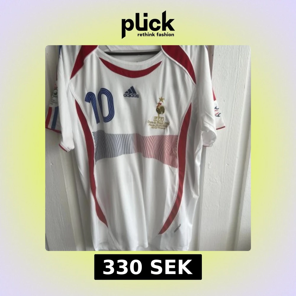 Säljer en officiell Frankrike fotbollströja från VM 2006 med Zidane och nummer 10 på ryggen. Tröjan är vit med röda och blå detaljer, Adidas-logga på bröstet och broderat VM-märke. Tillverkad i lätt polyester med korta ärmar och rund hals.