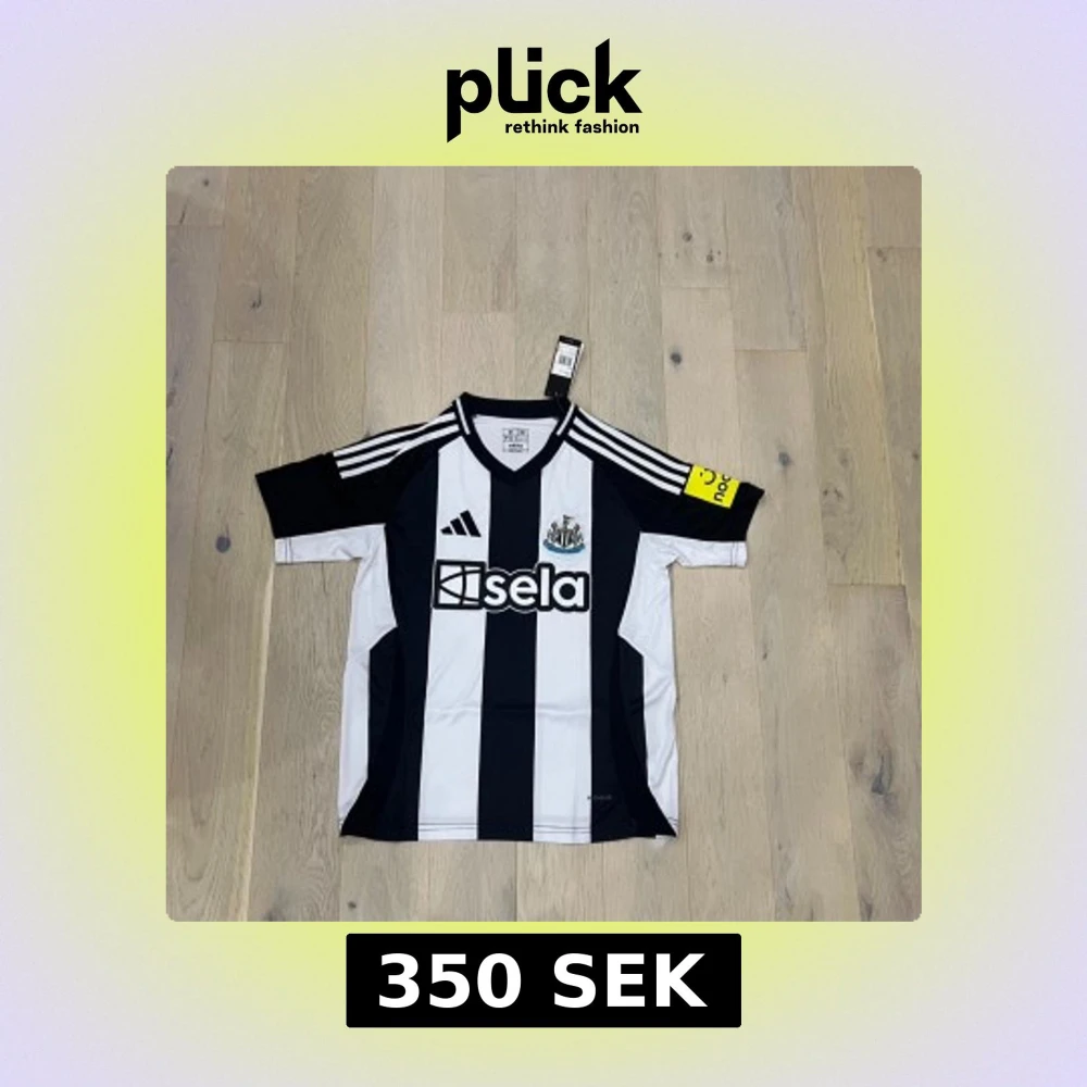 Snygg Newcastle United fotbollströja från adidas med klassiska svarta och vita ränder, klubbmärke på bröstet och sponsorlogga. Tröjan har korta ärmar, V-ringning och gula detaljer på ärmen. Tillverkad i lätt och ventilerande material.