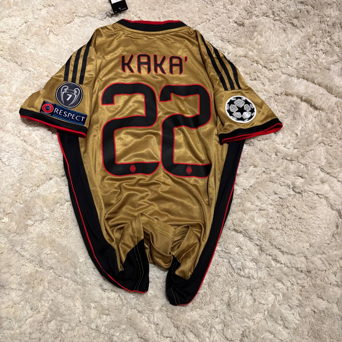 AC Milan fotbollströja i guld med svarta och röda detaljer, Adidas-märke och Fly Emirates-tryck. Kaka' 22 på ryggen, Champions League och Respect-patchar på ärmarna. Tillverkad i lätt och ventilerande climacool-material.