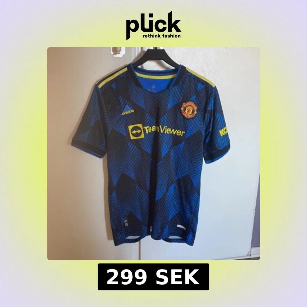 Snygg blå fotbollströja från Manchester United med ett geometriskt mönster. Tröjan har korta ärmar och gula detaljer, inklusive Adidas-loggan och sponsortryck. Perfekt för fans som vill visa sitt stöd med stil! 💙