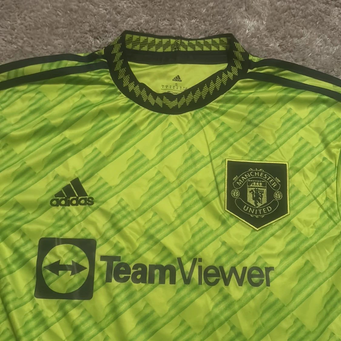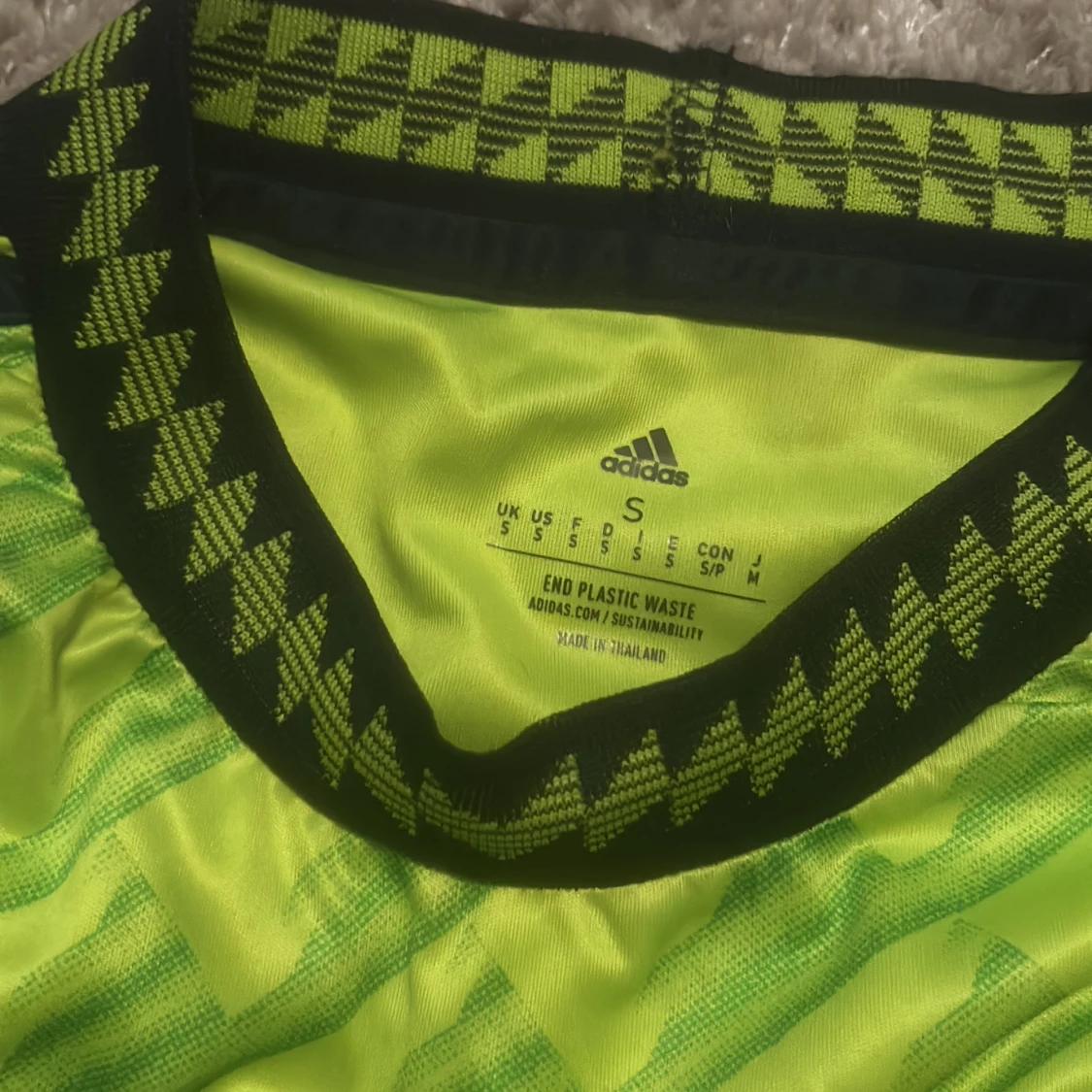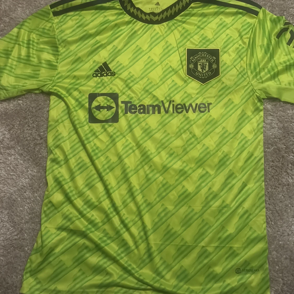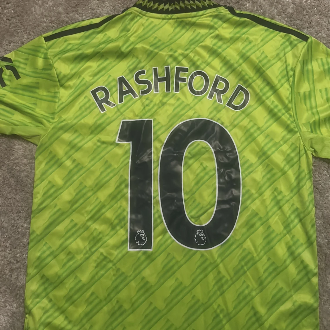 Säljer en grön Manchester United fotbollströja. och Rashford 10 på baksidan. Den är i storlek S och har använd den 1 gång så den är i toppskick