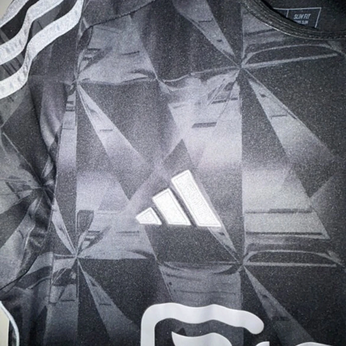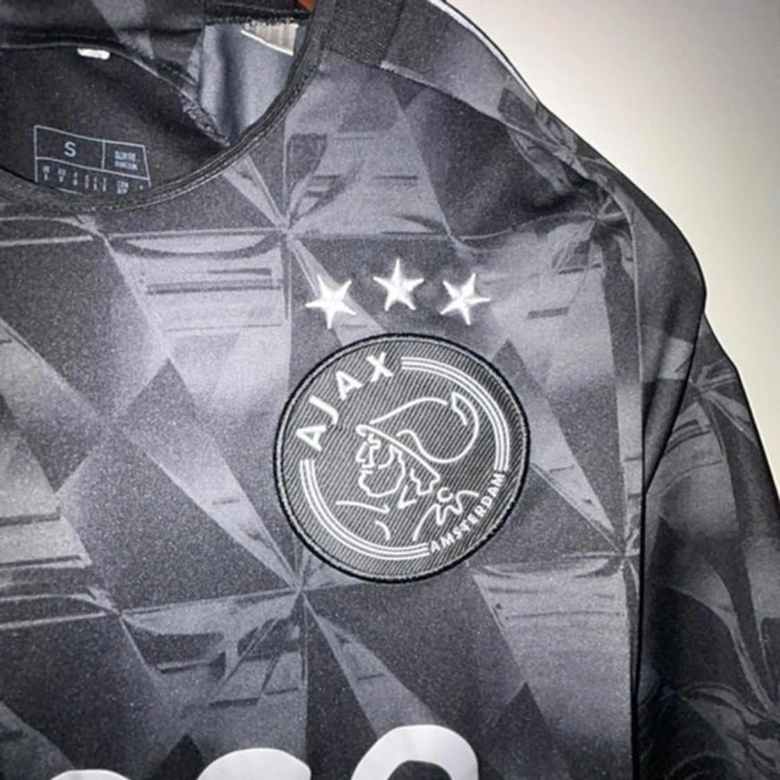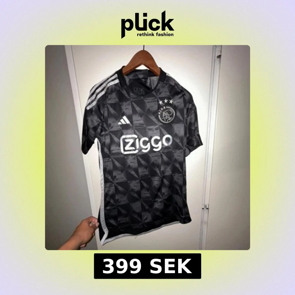 Ajax fotbollströja i svart med geometriskt mönster och vita detaljer. Adidas-logga och Ziggo sponsortryck på bröstet samt Ajax klubbmärke med tre stjärnor. Tröjan är kortärmad och tillverkad i ett lätt, tekniskt material som andas.