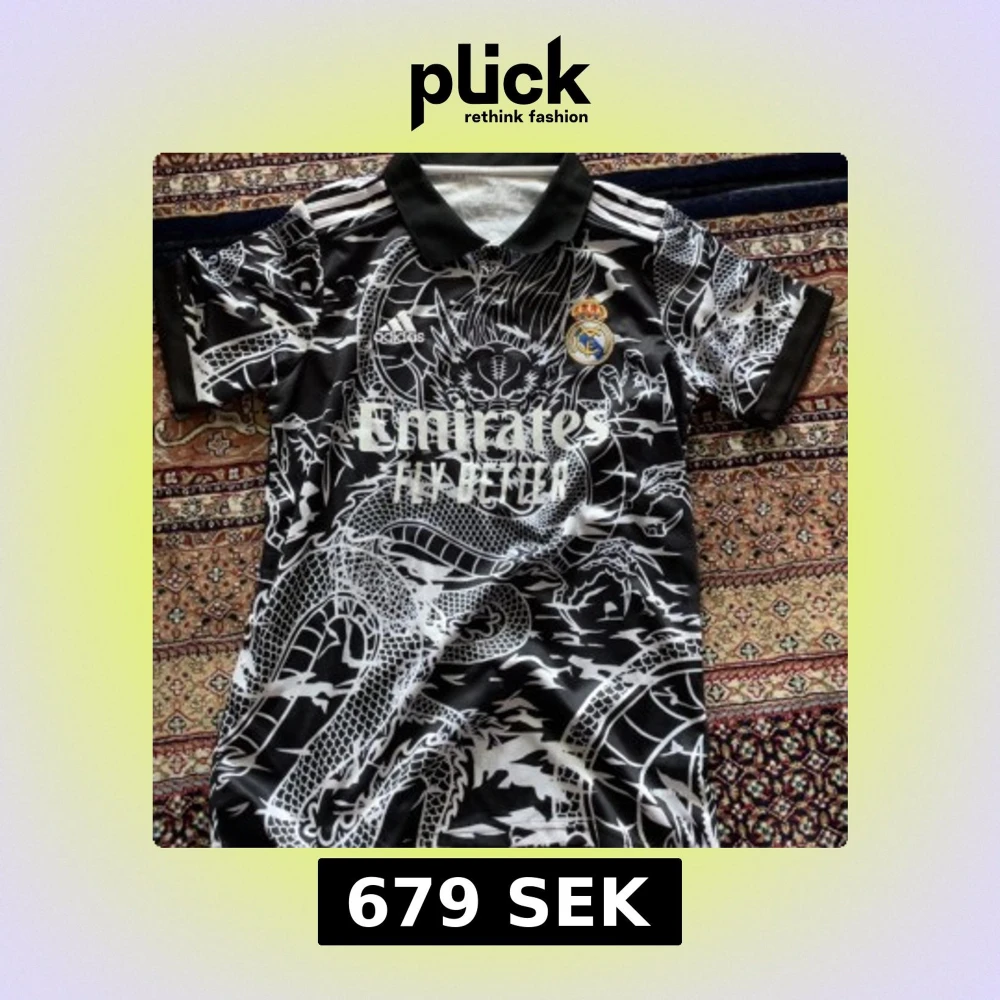 Snygg Real Madrid fotbollströja från Adidas i svart med vit drakmönster över hela tröjan. Klassisk krage, korta ärmar och broderat klubbmärke på bröstet. Materialet är lätt och andas, perfekt för träning eller häng. Emirates sponsortryck på framsidan. Direkt från Spanien