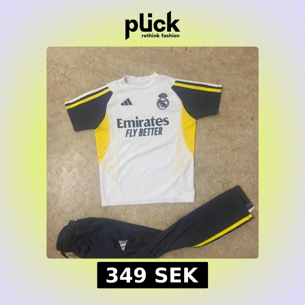 Snygg Real Madrid fotbollströja från Adidas med korta ärmar. Tröjan är vit med mörkblå och gula detaljer på sidorna och ärmarna, samt klubbmärke och sponsortryck på bröstet. Tillverkad i lätt och ventilerande polyester, perfekt för träning eller match.