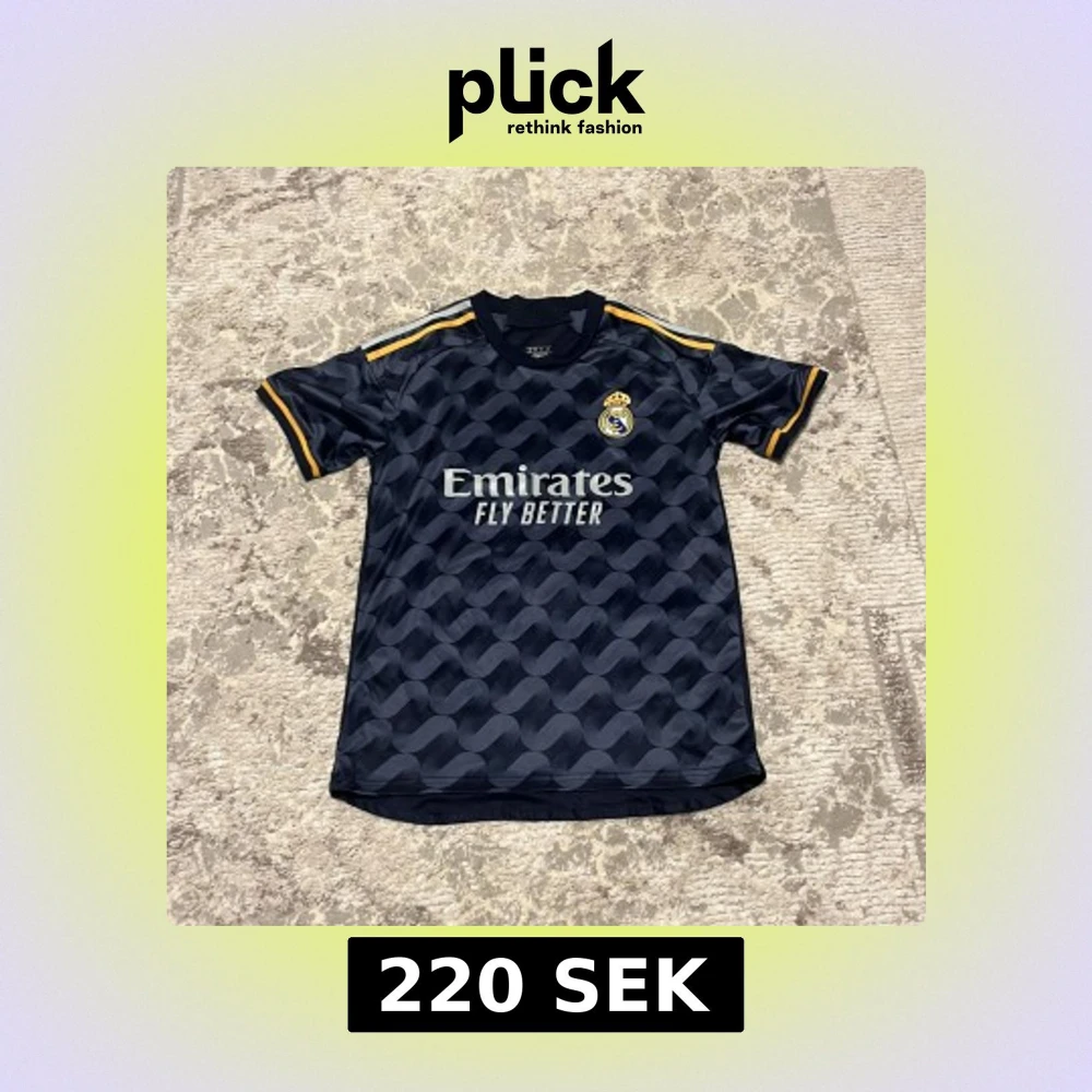 Snygg Real Madrid fotbollströja med Vini Jr. och nummer 7 på ryggen. Tröjan är mörkblå med ett vågigt mönster, gula detaljer på axlar och ärmslut samt klubbmärke på bröstet. Tillverkad i lätt polyester, perfekt för du som älskar Real Madrid.