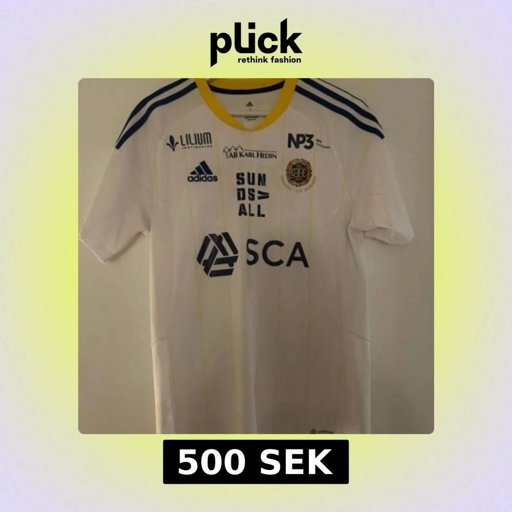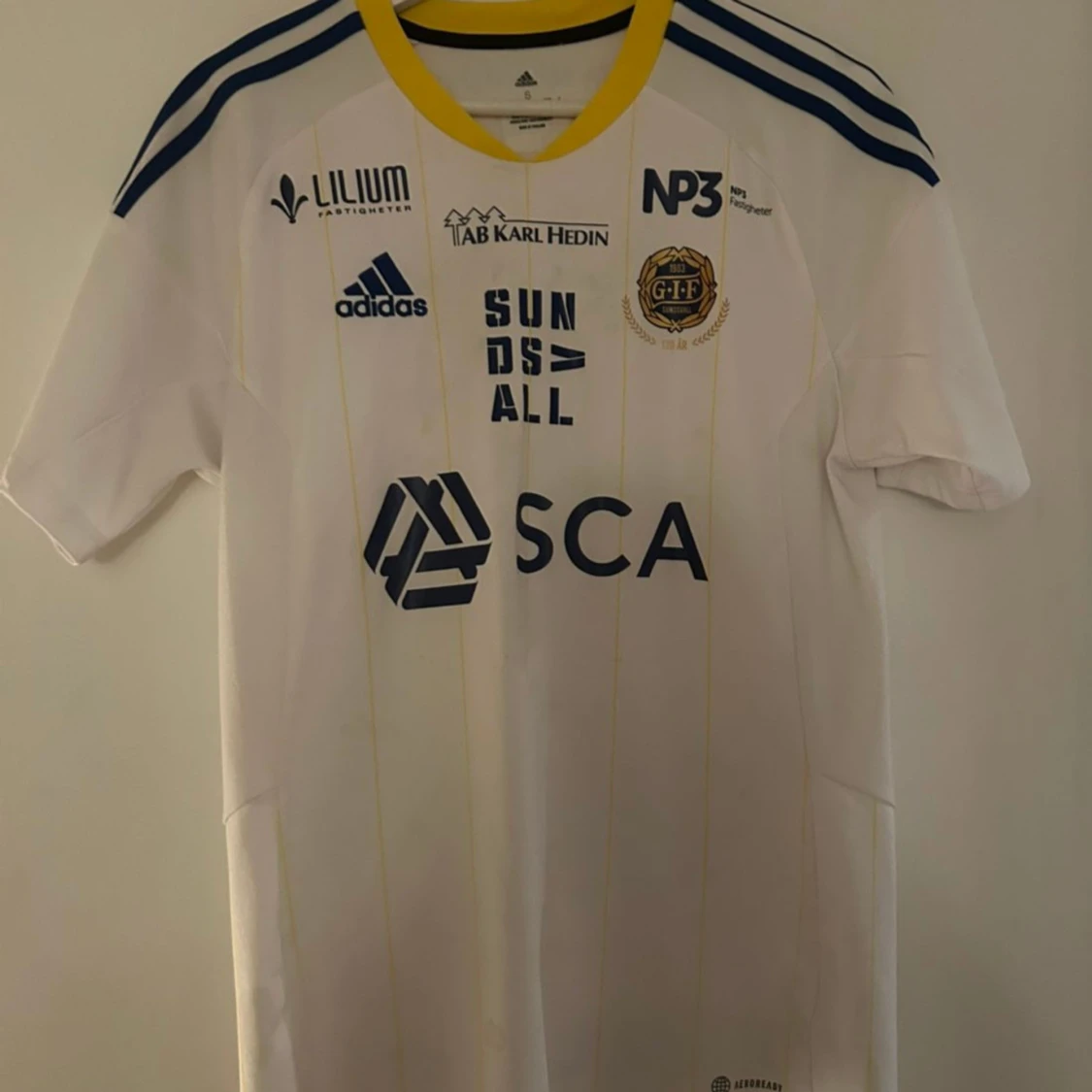 Snygg vit fotbollströja från Adidas för GIF Sundsvall med gula detaljer och blå logotyper. Tröjan har korta ärmar, tunna gula ränder och klubbmärke på bröstet. Perfekt för dig som vill visa ditt stöd på läktaren eller på planen.
