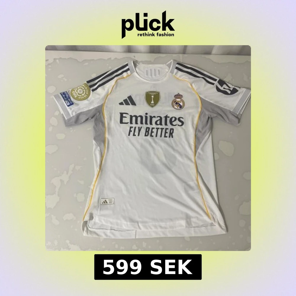 Säljer en officiell Real Madrid fotbollströja från Adidas, säsong 2024, med Valverde och nummer 8 på ryggen. Tröjan är vit med grå detaljer, gula linjer och svarta tryck. Slim fit, kortärmad och tillverkad i ventilerande polyester. FIFA Intercontinental Champions-märke på bröstet.