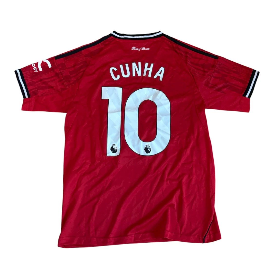 Röd Manchester United fotbollströja från Adidas med tryck 'Cunha 10' på ryggen. Tröjan har klubbmärke på bröstet, vita och svarta detaljer samt sponsorlogga på framsidan. Tillverkad i lätt och ventilerande polyester, perfekt för match eller träning.
