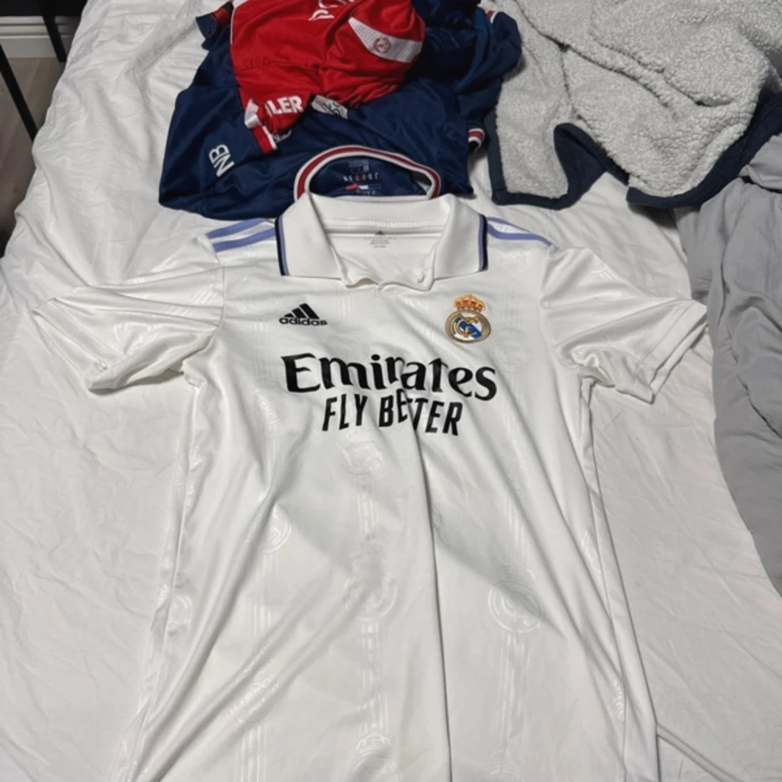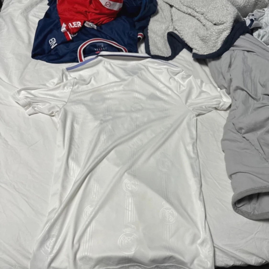 Snygg vit Real Madrid fotbollströja från Adidas med korta ärmar. Tröjan har klubbens emblem och sponsorlogga på framsidan. Perfekt för alla fotbollsfans som vill visa sitt stöd för laget. Äkta kostar 1400 ny kan diskurera pris