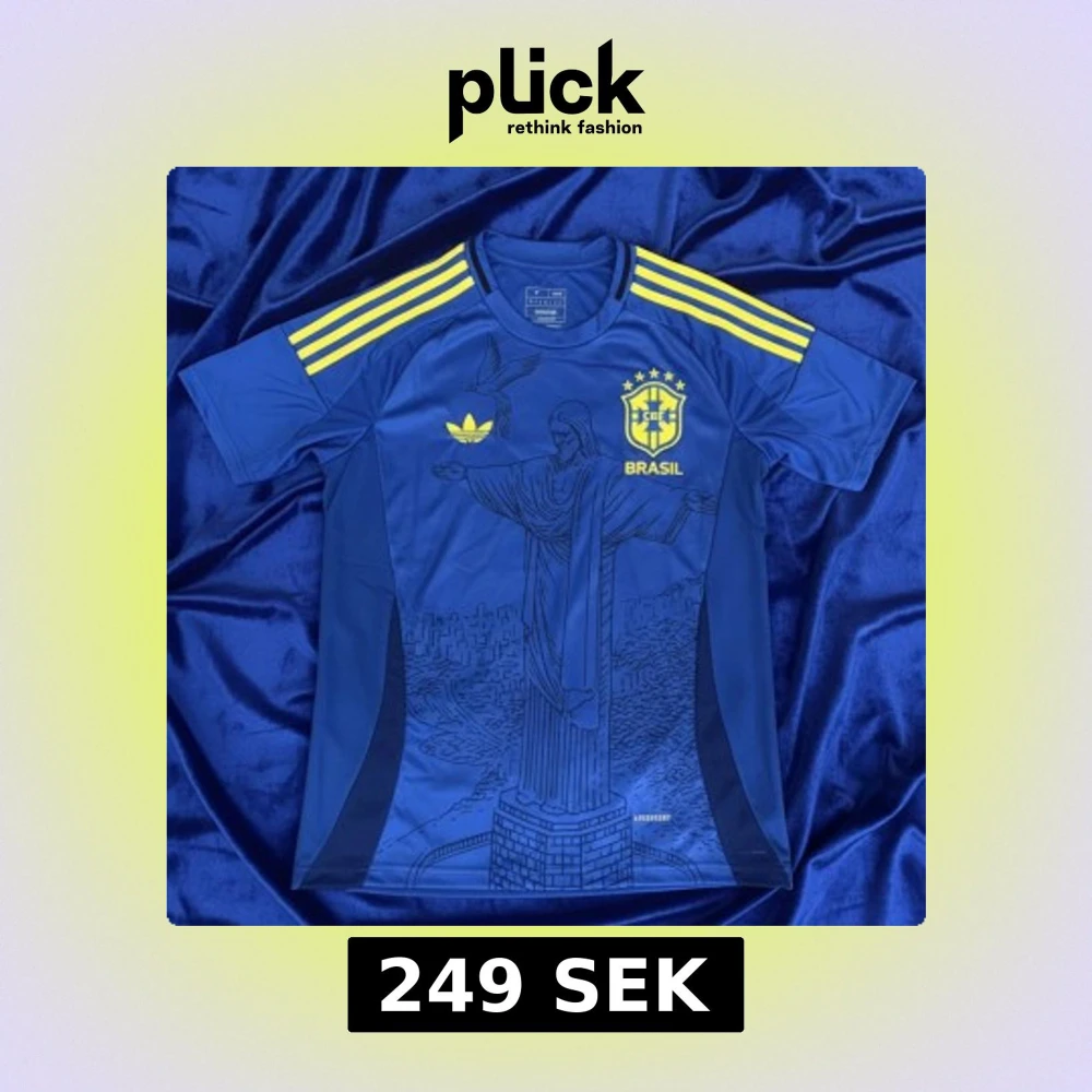 Snygg blå Brasilien fotbollströja från Adidas med gula detaljer och tre ränder på axlarna. Tryck av Kristusstatyn på framsidan och Brasilien-emblem på bröstet. Tillverkad i lätt och ventilerande material, perfekt för match eller träning.