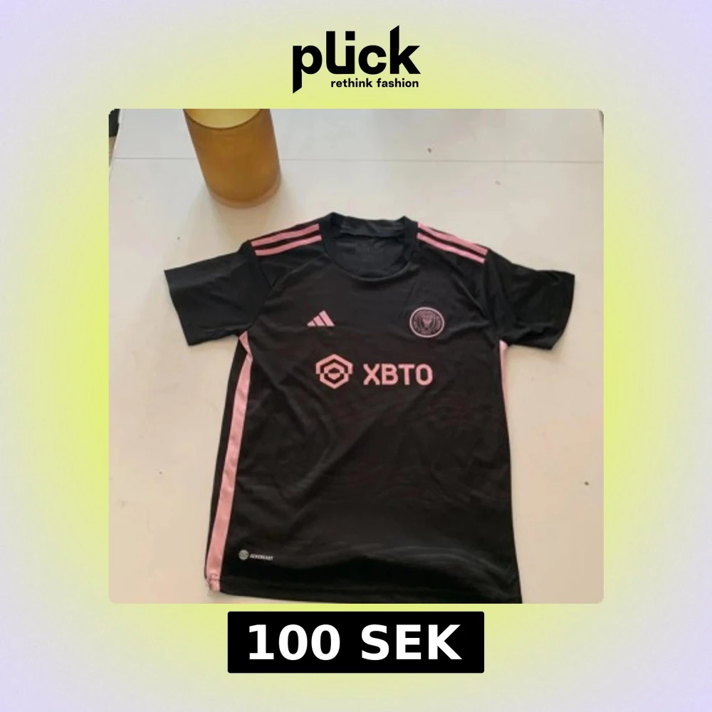 Säljer en svart Inter Miami fotbollströja från Adidas med rosa detaljer och tryck. Messi #10 på ryggen, klubbmärke på bröstet och XBTO sponsor framtill. Tröjan har korta ärmar och är tillverkad i lätt polyester med Aeroready-teknologi. Sista två bilderna är mina egna, obs att en av bokstäverna på ryggen har försvunnit lite