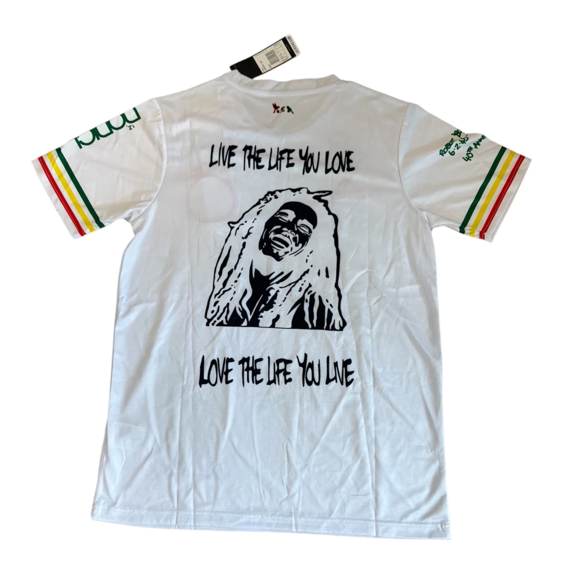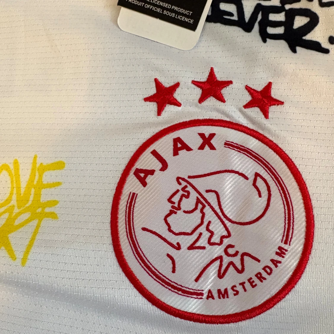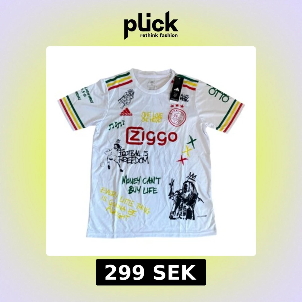 Ajax x Bob Marley limited edition fotbollströja i vitt med färgglada ränder på ärmarna. Tryck med Bob Marley, graffiti-inspirerade texter och Ajax-logga på bröstet. Materialet är lätt och andas, perfekt för fotboll eller streetwear. Ziggo sponsortryck på framsidan.