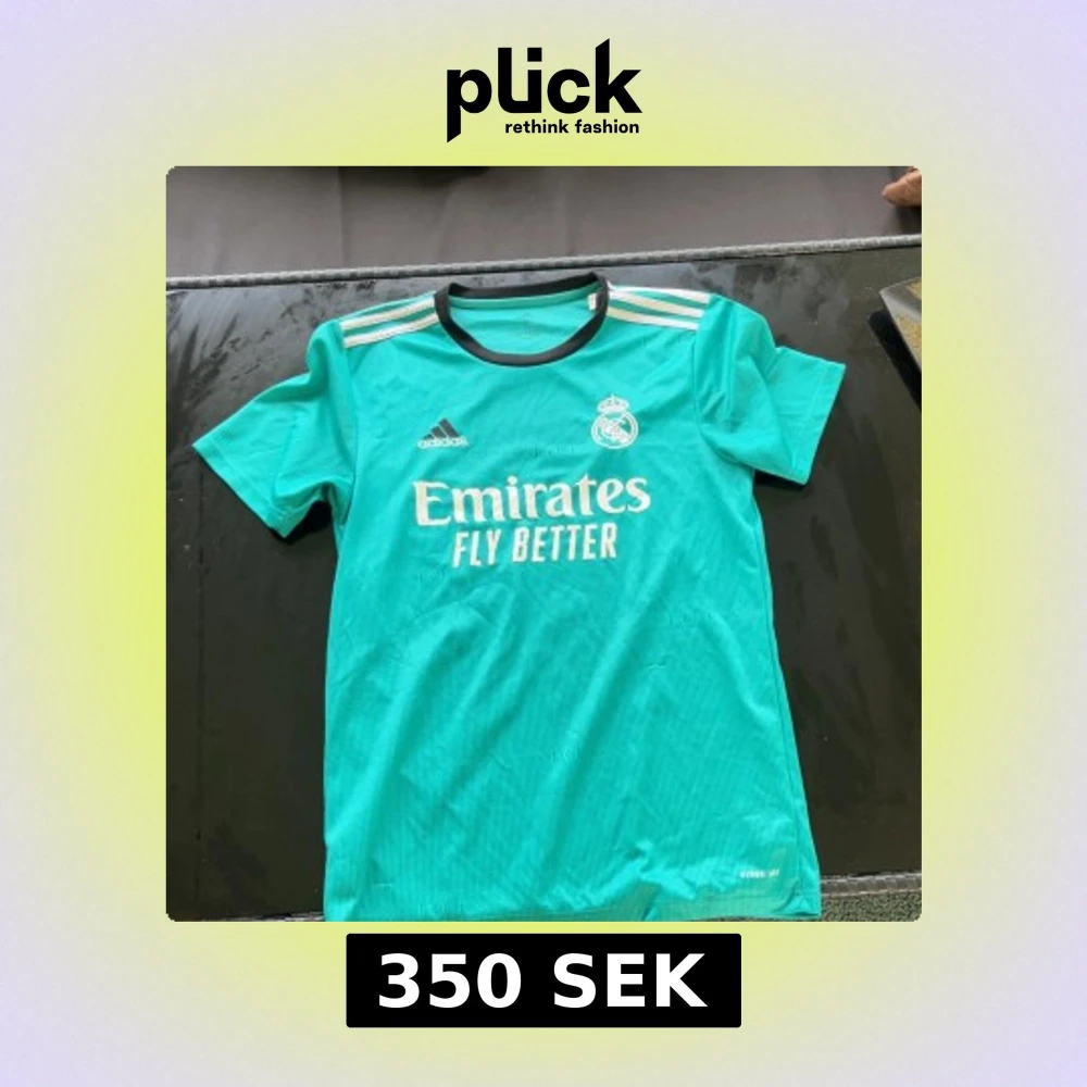 Snygg turkos Real Madrid bortatröja från Adidas med vita detaljer och svarta inslag vid kragen. Tröjan har korta ärmar, klassiska Adidas-ränder på axlarna och klubbmärke samt sponsortryck på bröstet. Tillverkad i lätt och ventilerande material. Den är äkta, köpt i Spanien.