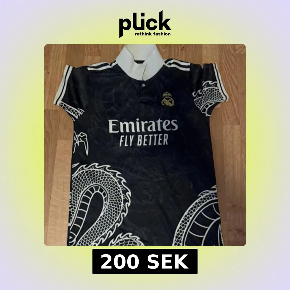 Säljer en svart Real Madrid fotbollströja med vit drakdesign och vit krage. Tröjan har korta ärmar, klubbmärke på bröstet och Emirates Fly Better-tryck. Snygga vita detaljer på axlar och ärmslut. Perfekt för dig som vill sticka ut på planen.