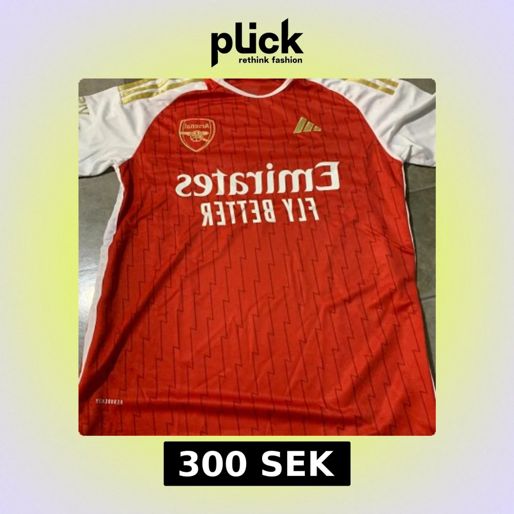 Säljer en officiell Arsenal fotbollströja från Adidas i storlek S. Tröjan är röd med vita ärmar och har guldiga detaljer på axlarna. Den har ett blixtmönster över hela framsidan och baksidan, samt Arsenal-logga och Adidas-märke på bröstet. Materialet är lätt och andas.