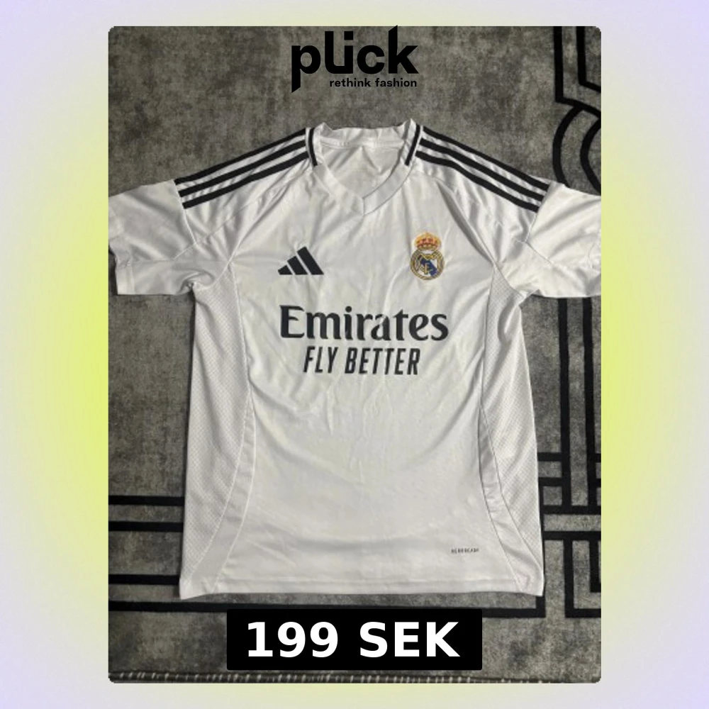 Säljer en officiell Real Madrid fotbollströja från Adidas i vit färg med svarta detaljer och broderat klubbmärke. Tröjan har korta ärmar, V-ringad krage och tre svarta ränder på axlarna. Materialet är lätt och andas, perfekt för träning eller match.
