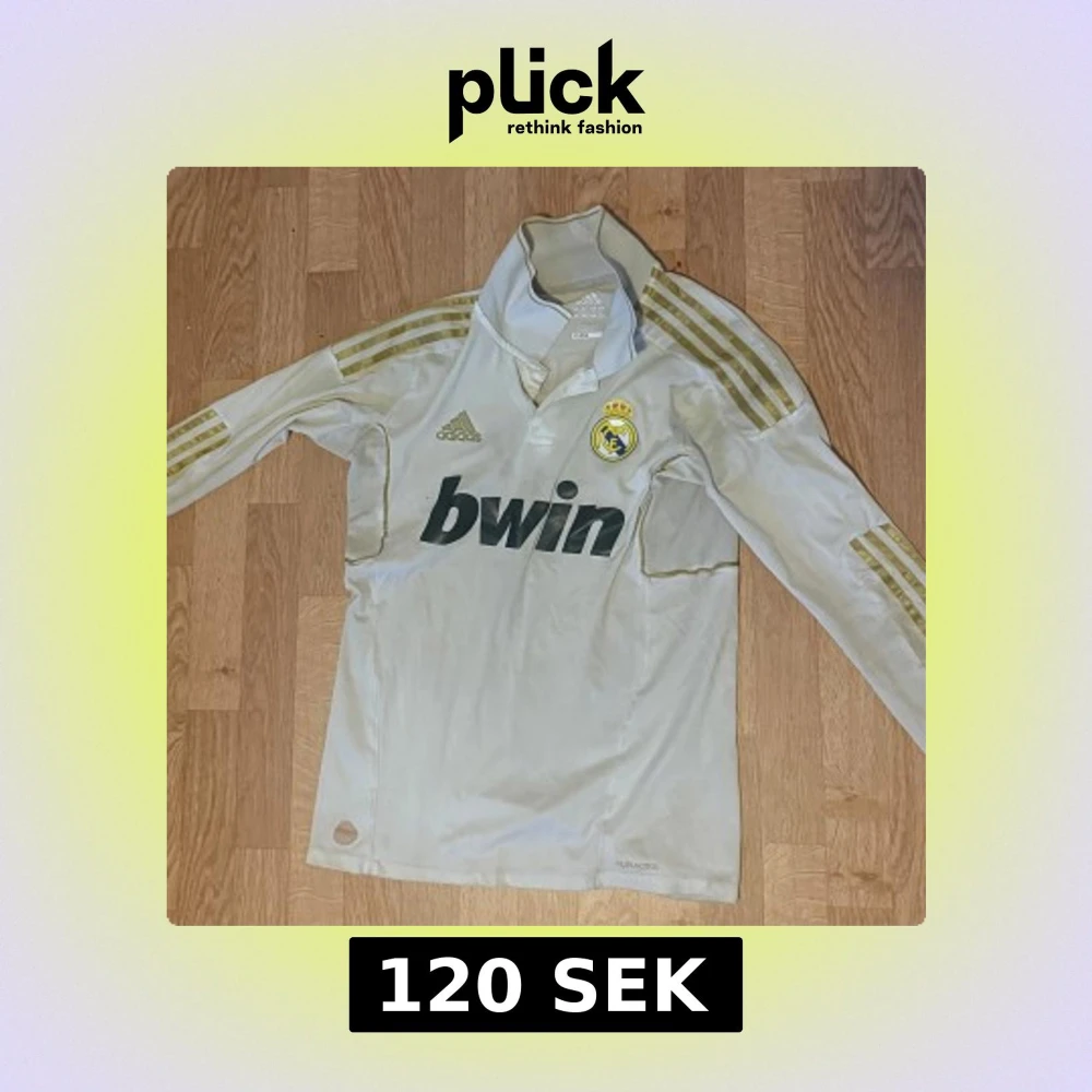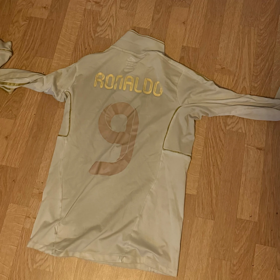 Säljer en långärmad Real Madrid fotbollströja från Adidas med Ronaldo och nummer 9 på ryggen. Tröjan är vit med guldiga detaljer och Adidas klassiska ränder på ärmarna. Tillverkad i lätt och ventilerande material (Climacool) och har klubbmärket på bröstet.