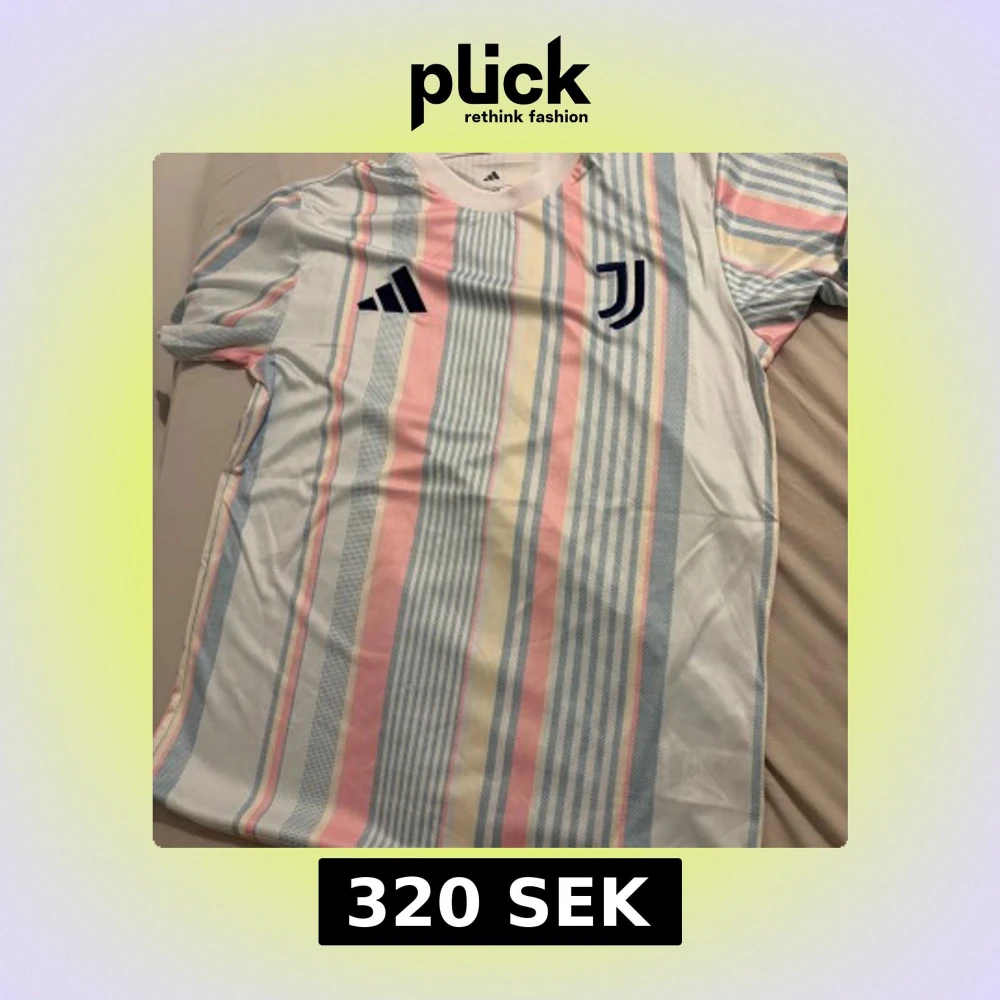 Juventus fotbollströja från Adidas i slim fit, storlek S. Tröjan har ett fräscht randigt mönster i ljusblått, rosa, vitt och ljusgult. Kortärmad modell med rund hals och Juventus-logga på bröstet. Tillverkad i lätt och ventilerande polyester.