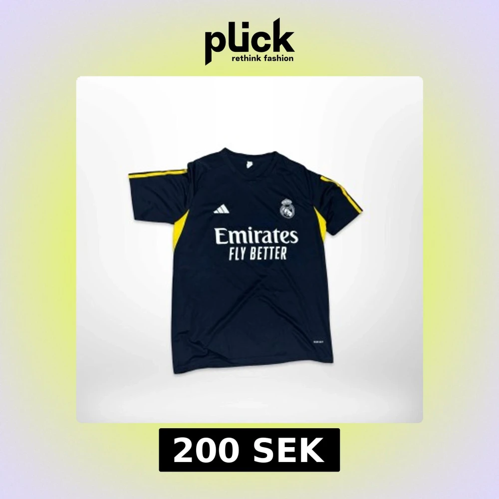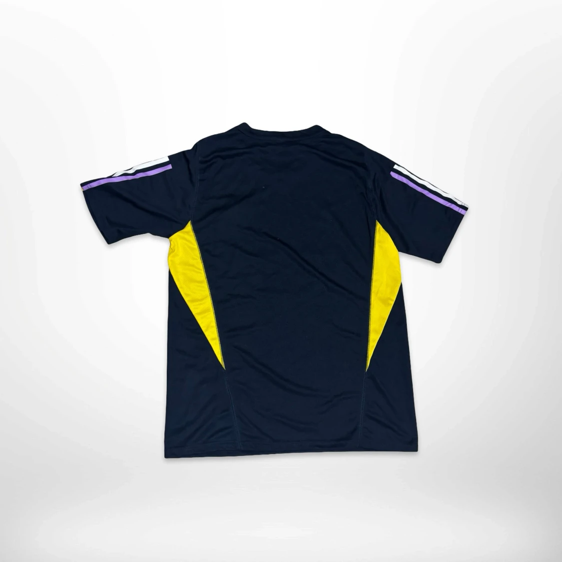 Snygg marinblå Real Madrid fotbollströja från Adidas med vit logga och tryck på bröstet. Tröjan har gula paneler på sidorna och gula detaljer på ärmarna, samt lila och vita ränder på ena ärmen. Tillverkad i lätt och ventilerande polyester.