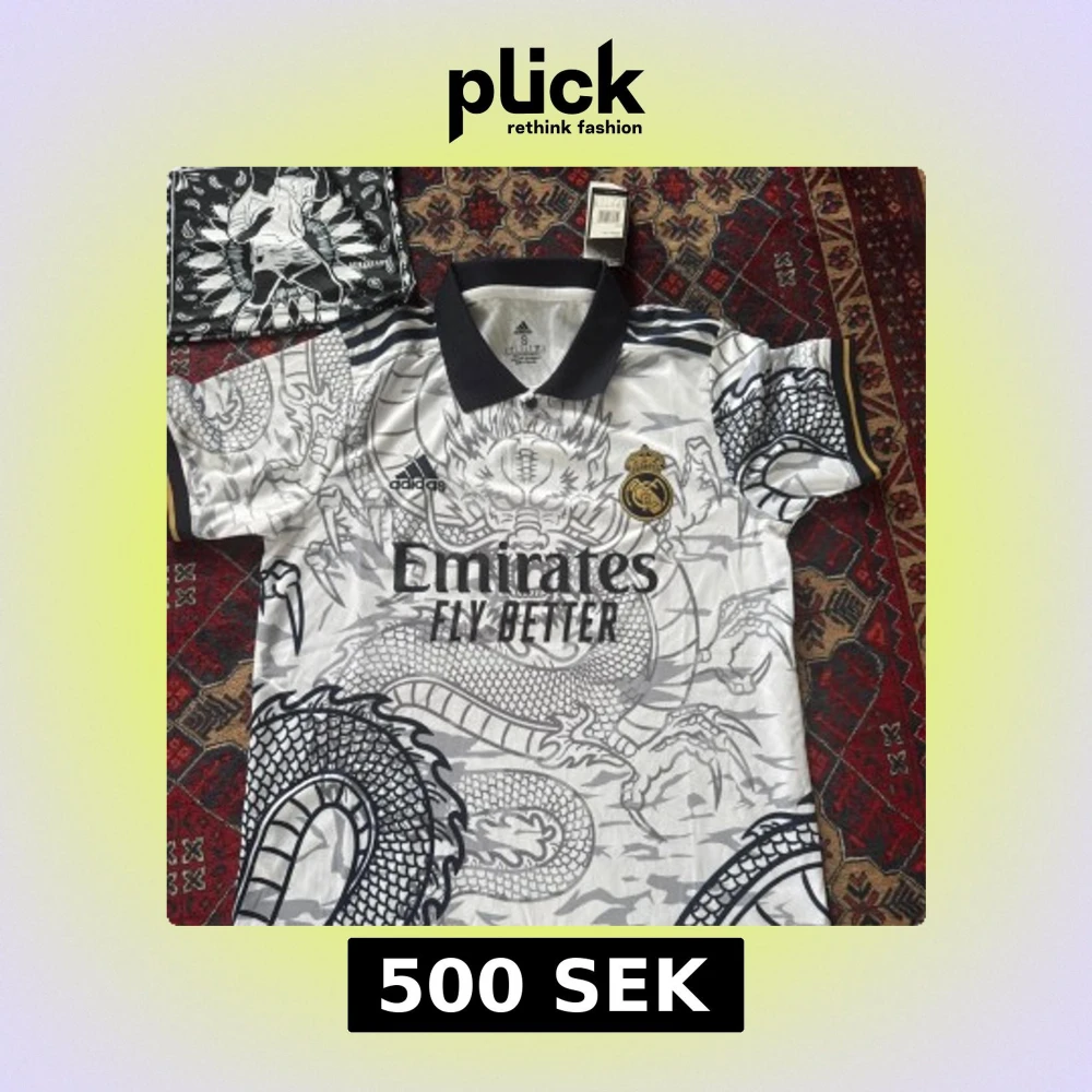 Säljer en vit och svart Real Madrid fotbollströja från Adidas med ett stort drakmönster över hela tröjan. Tröjan har korta ärmar, svart krage och klubbmärke i guld på bröstet. Perfekt för dig som vill sticka ut på läktaren eller planen.Storleken på tröjan är S, De är helt nya passa på köp, du kan även beställa andra fotbollströjor av oss de ba o skriva privat till oss så löser vi, köparen står för frakten.