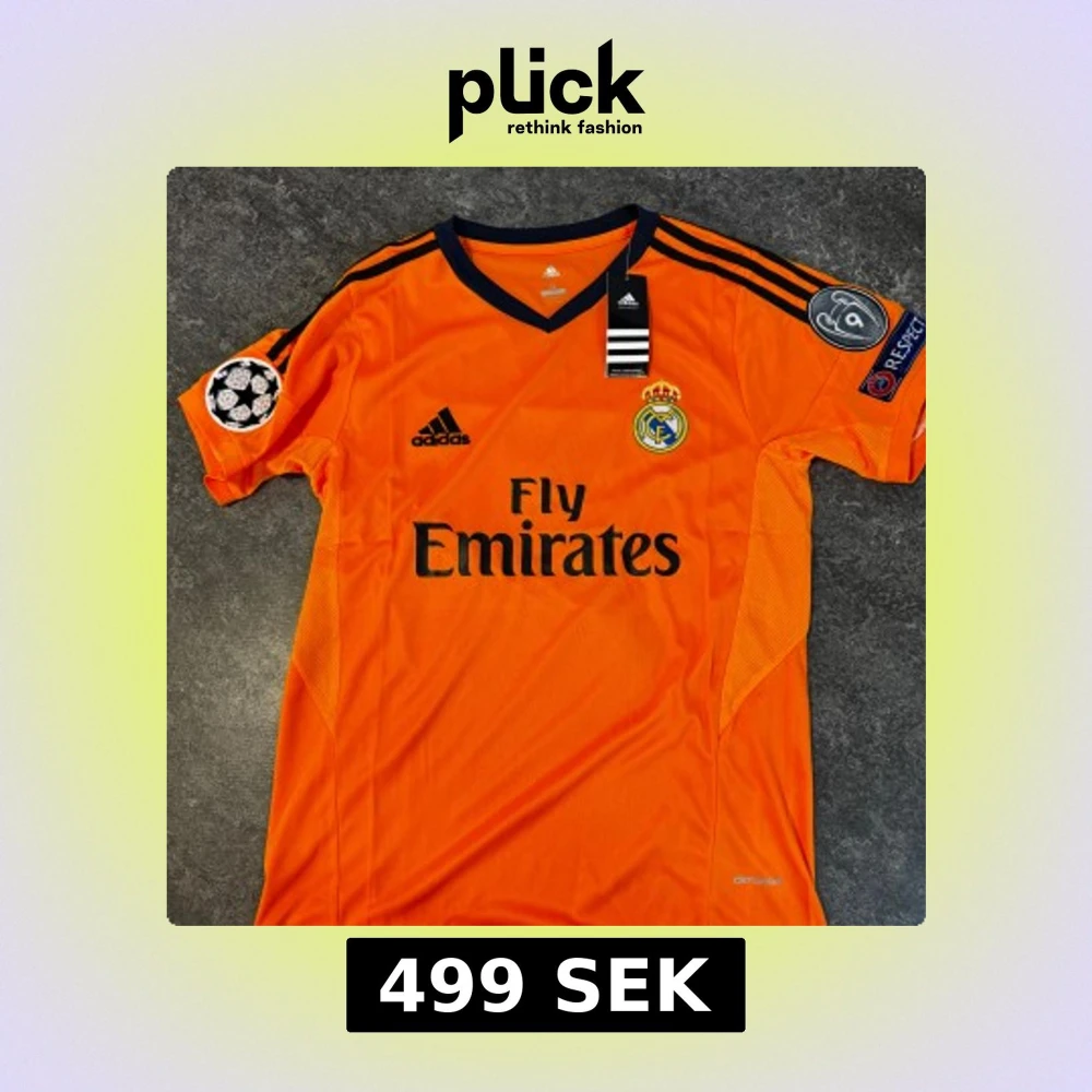 Säljer en orange Real Madrid fotbollströja från Adidas med Ronaldo 7 på ryggen. Tröjan har svarta detaljer, klubbmärke och Champions League-patch på ärmen. Fly Emirates tryck på bröstet och Climacool-material.