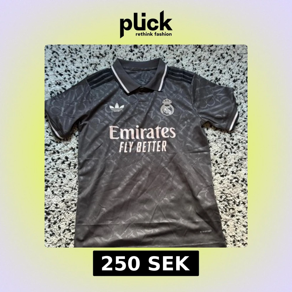 Snygg mörkgrå Real Madrid fotbollströja från Adidas med klassisk krage och vita detaljer. Tröjan har korta ärmar, diskret mönster i tyget och broderade loggor. Materialet är lätt och andas, perfekt för träning eller match.