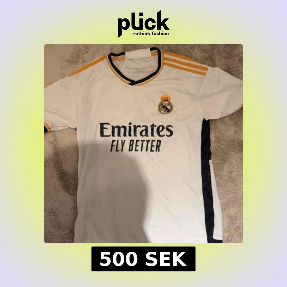 Säljer en officiell Real Madrid fotbollströja från Adidas med Bellingham och nummer 5 på ryggen. Tröjan är vit med gula och svarta detaljer, klubbmärke på bröstet och 'Emirates Fly Better' tryck på framsidan. Klassisk V-ringning och korta ärmar.