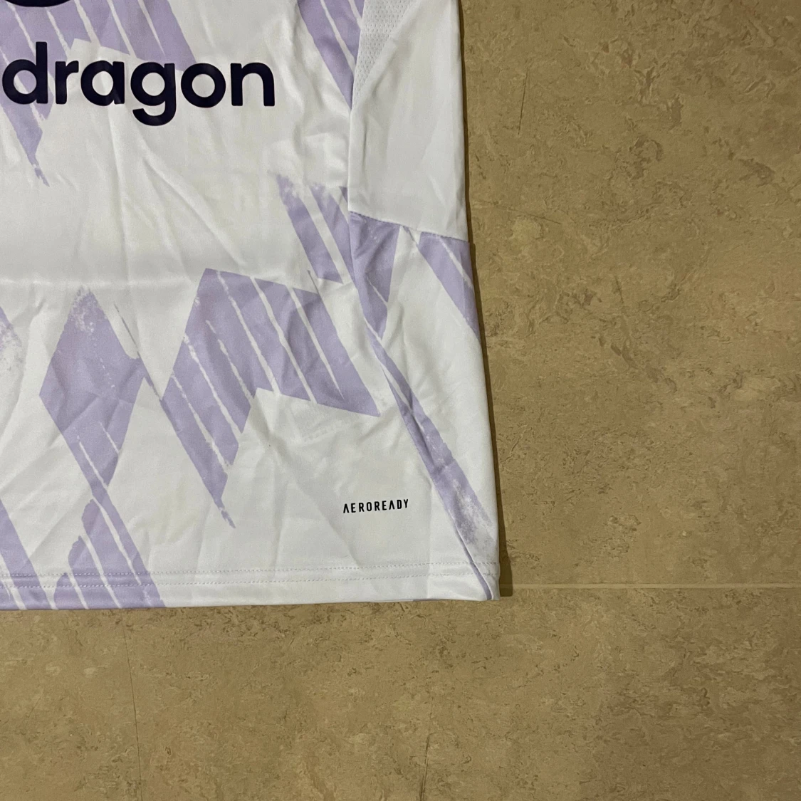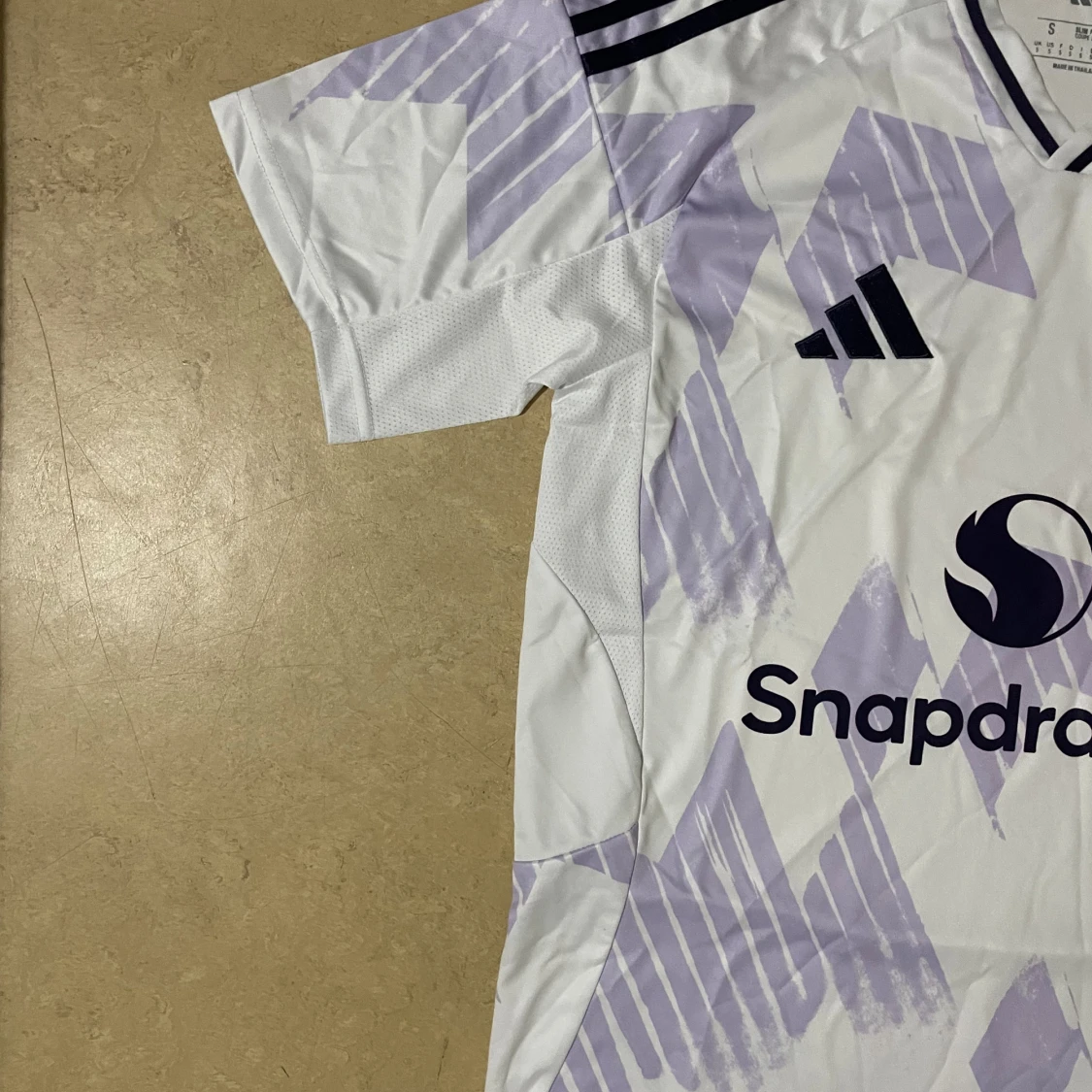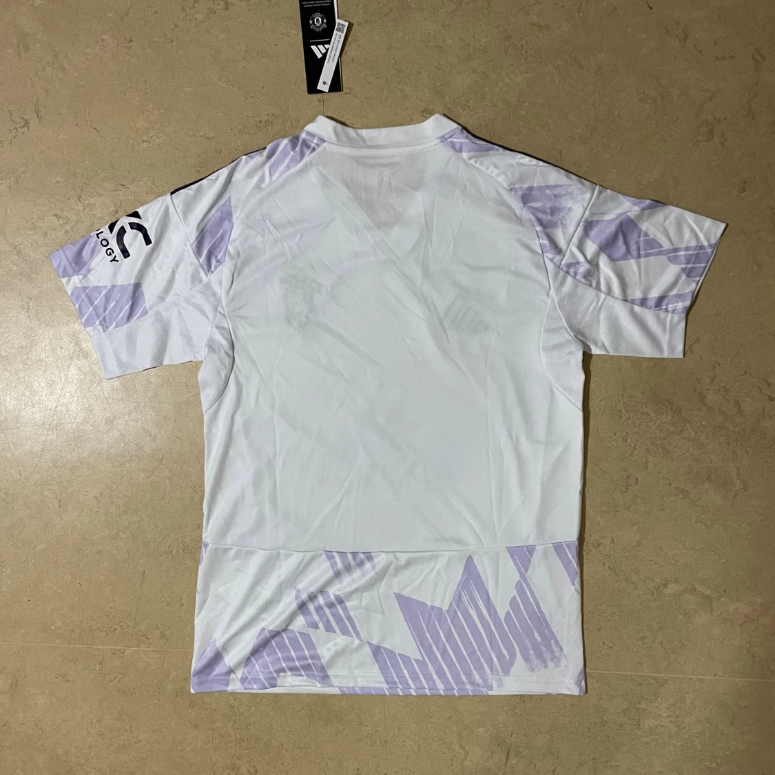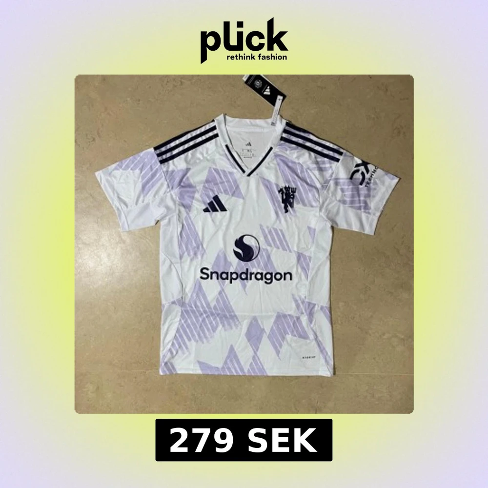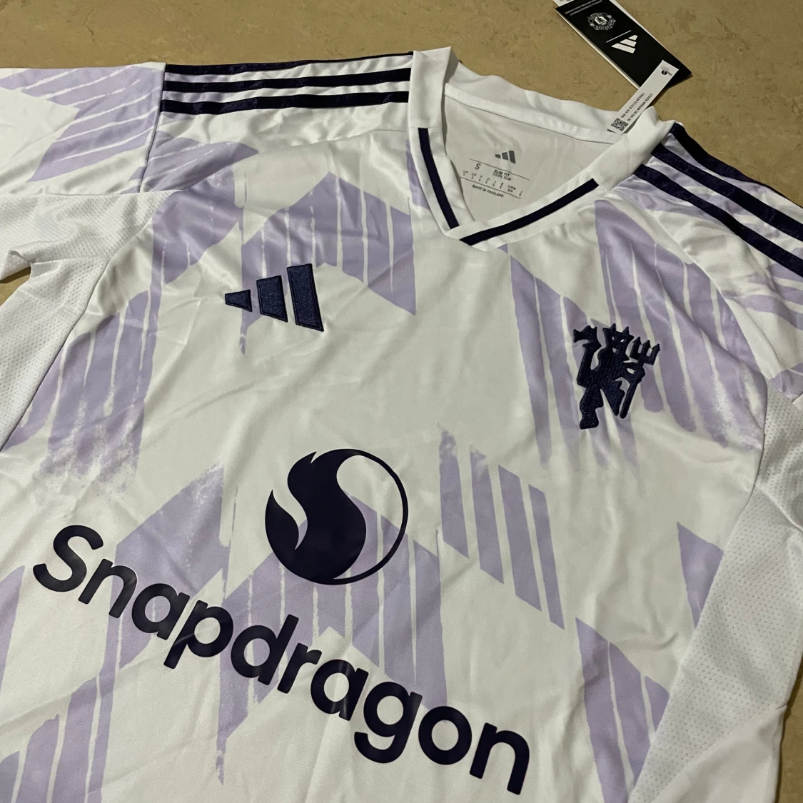 Snygg Manchester United fotbollströja från Adidas med Snapdragon sponsortryck. Tröjan är vit med ljuslila geometriskt mönster, har svarta Adidas-ränder på axlarna och klubbmärke på bröstet. Tillverkad i lätt och ventilerande material, perfekt för träning eller match.