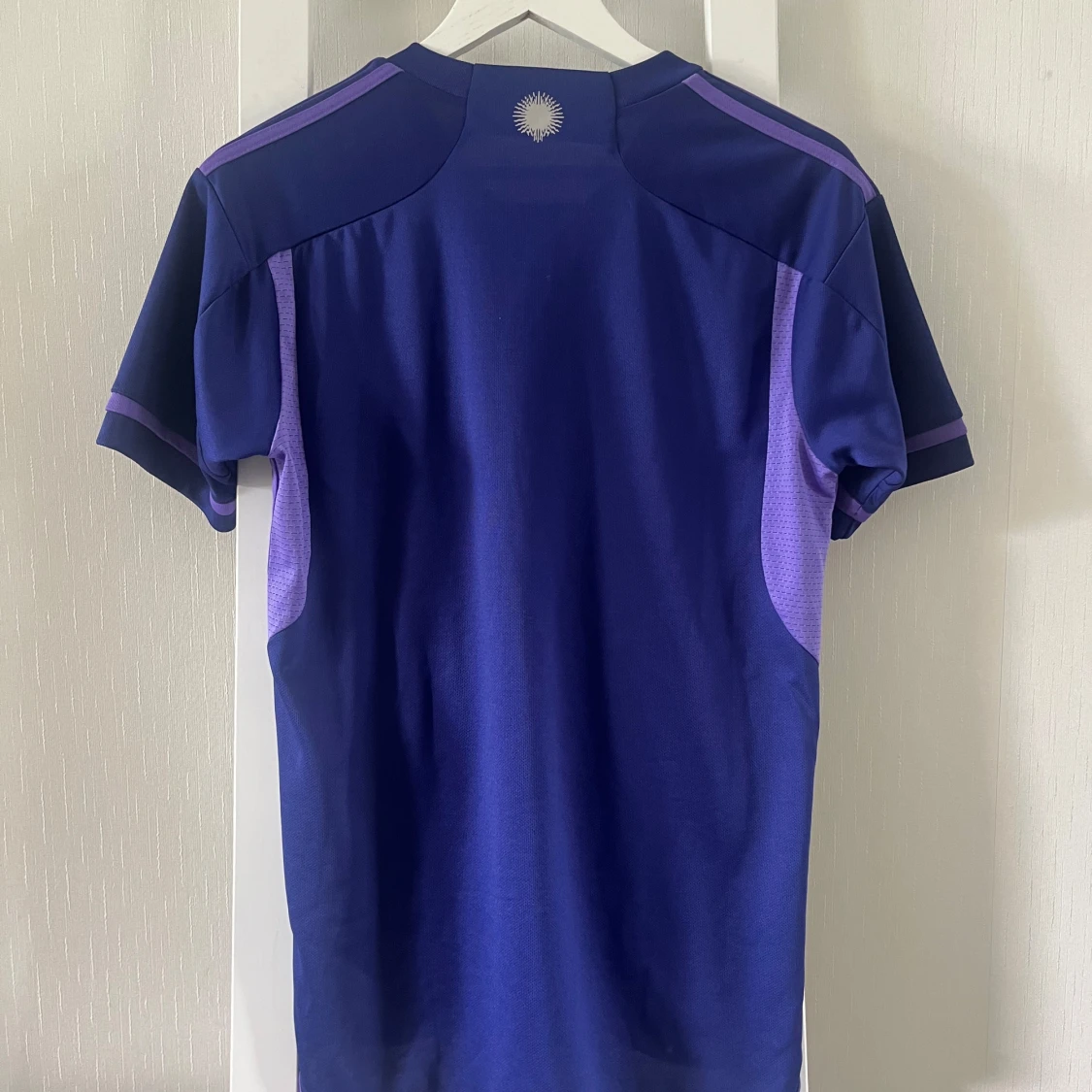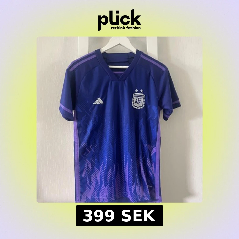Snygg Argentina fotbollströja från Adidas i blått och lila med korta ärmar. Tröjan har AFA-emblem och Adidas-logga på bröstet, samt lila detaljer på axlar och ärmslut. Tillverkad i lätt och ventilerande funktionsmaterial, perfekt för match eller träning.