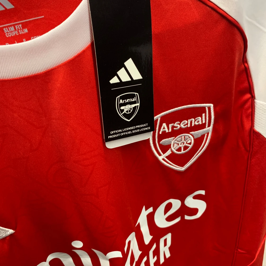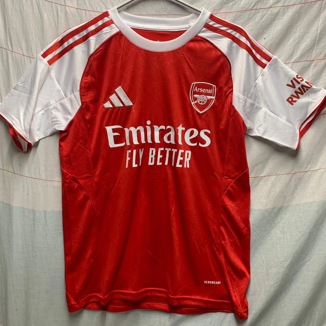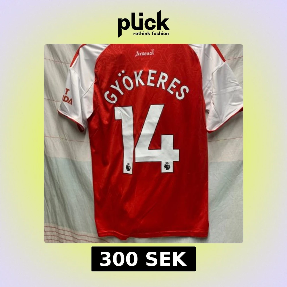 Snygg Arsenal fotbollströja från Adidas med Gyökeres och nummer 14 på ryggen. Röd kropp med vita ärmar och detaljer, broderat Arsenal-emblem och Adidas-logga på bröstet. Materialet är lätt och andas, perfekt för match eller träning. Emirates Fly Better tryck på framsidan.