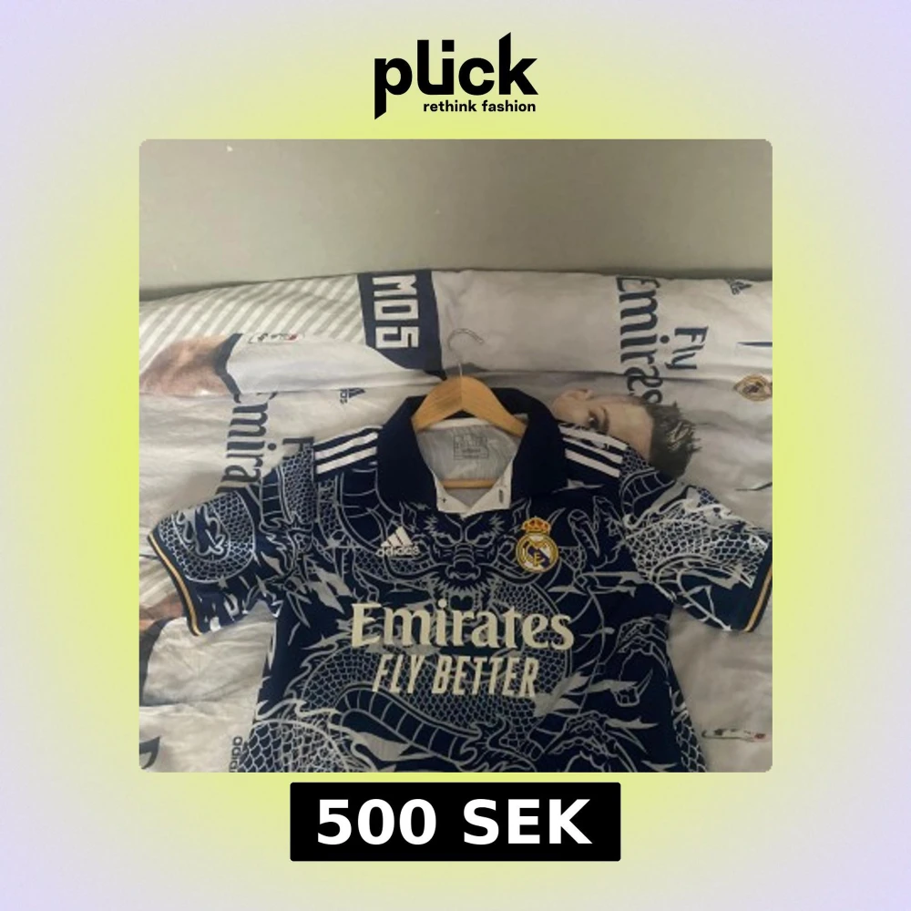 Säljer en fet Real Madrid fotbollströja från Adidas i marinblått med unikt drakmönster över hela tröjan. Klassisk krage, vita detaljer och klubbmärke på bröstet. Materialet är lätt och andas, perfekt för match eller träning. Emirates Fly Better tryck på framsidan. Skriv för att diskutera pris !