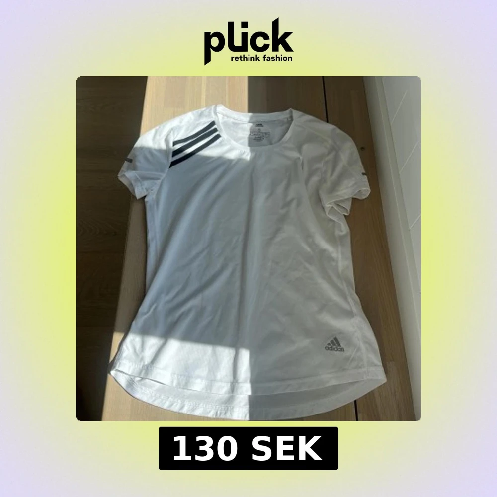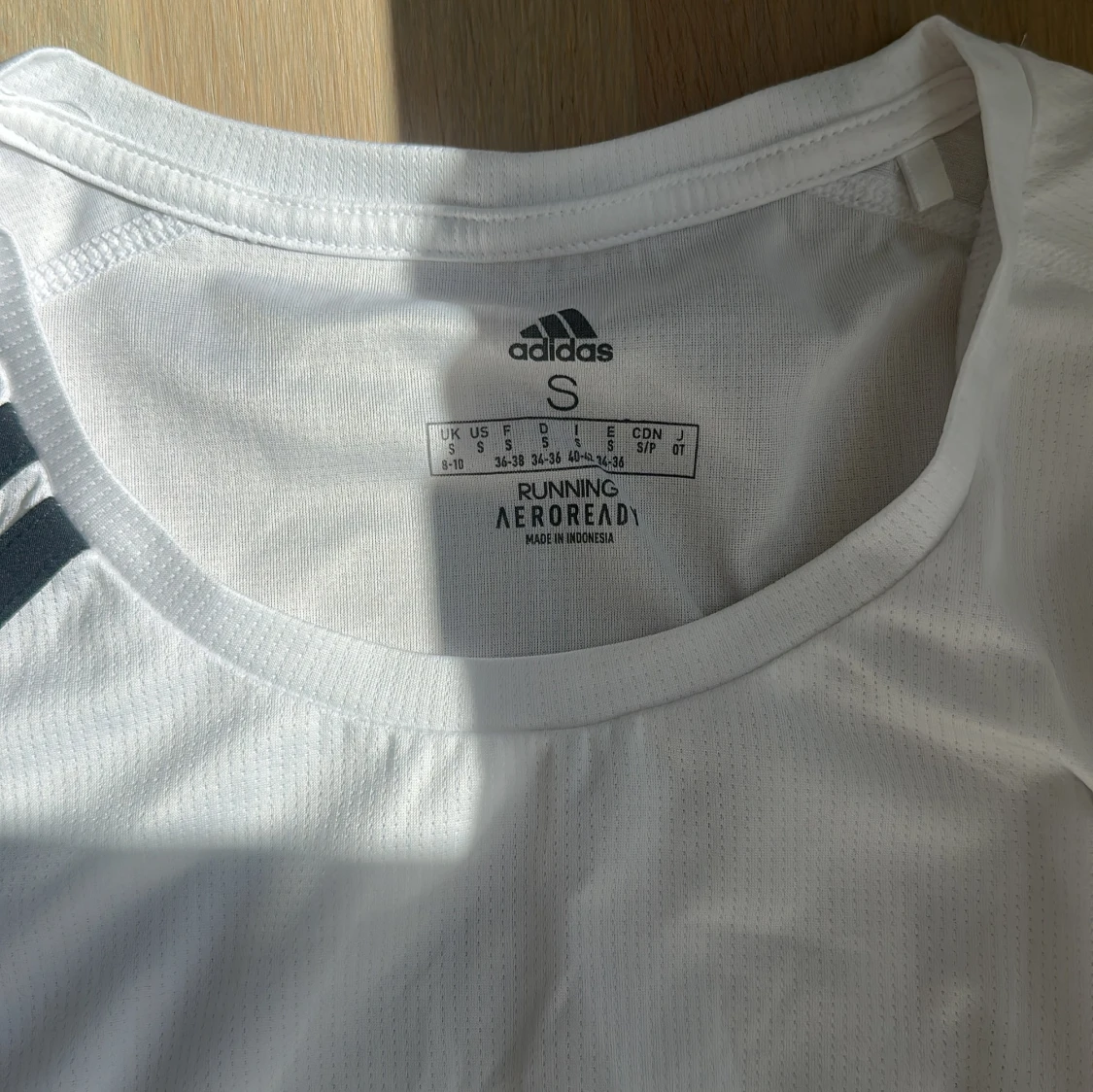 Vit t-shirt från Adidas med klassiska svarta ränder på axeln och diskret logga nertill. Modellen är kortärmad och tillverkad i lätt, ventilerande polyester med AEROREADY-teknologi, perfekt för löpning eller träning. Snygg och sportig passform.
