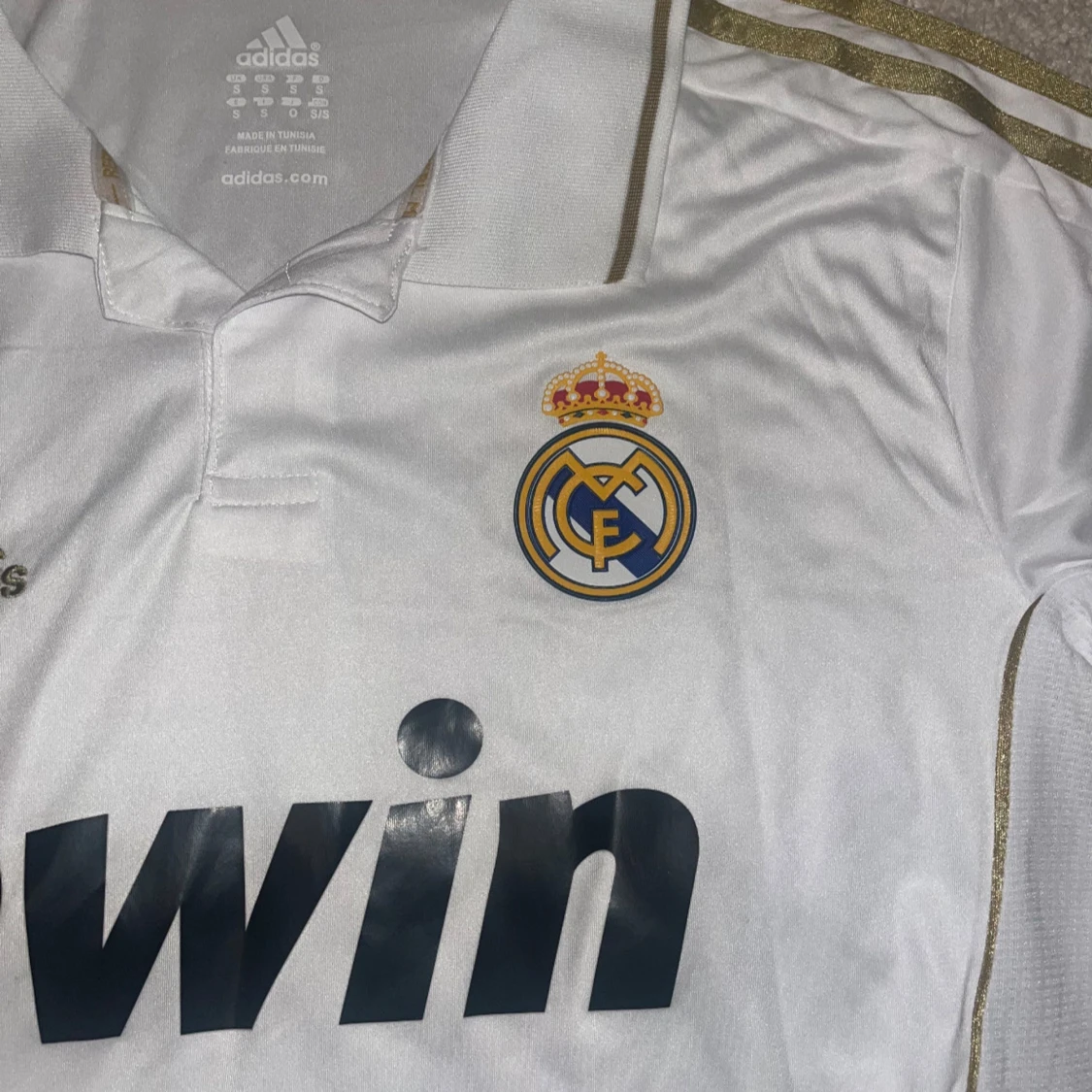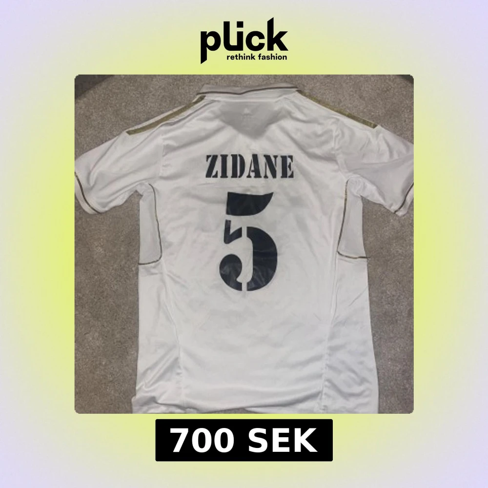 Vit Real Madrid fotbollströja från Adidas med Zidane och nummer 5 på ryggen. Tröjan har klubbmärke på bröstet, guldiga detaljer på axlarna och klassisk krage. Materialet är lätt och andas, perfekt för match eller träning.