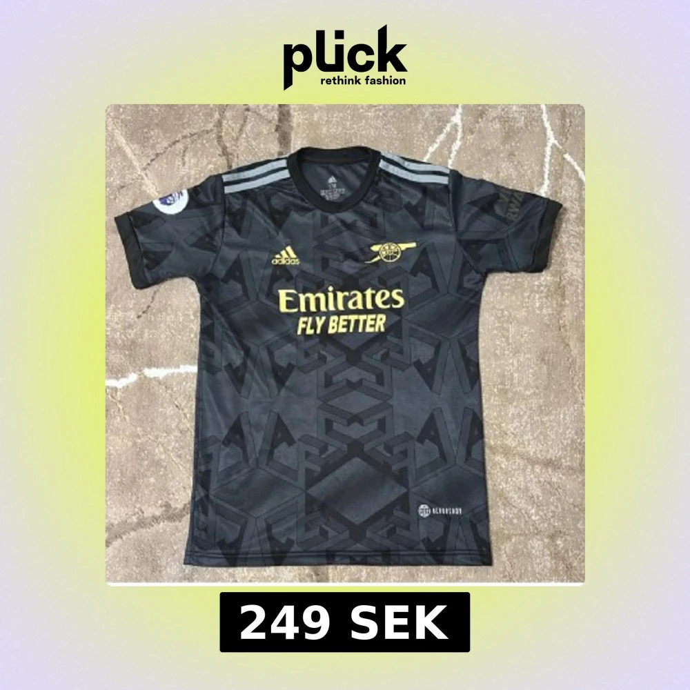 Snygg svart Arsenal fotbollströja från Adidas med gul logga och tryck. Tröjan har korta ärmar, geometriskt mönster och klassiska Adidas-ränder på axlarna. Materialet är lätt och andas, perfekt för träning eller match. Emirates sponsortryck på bröstet.
