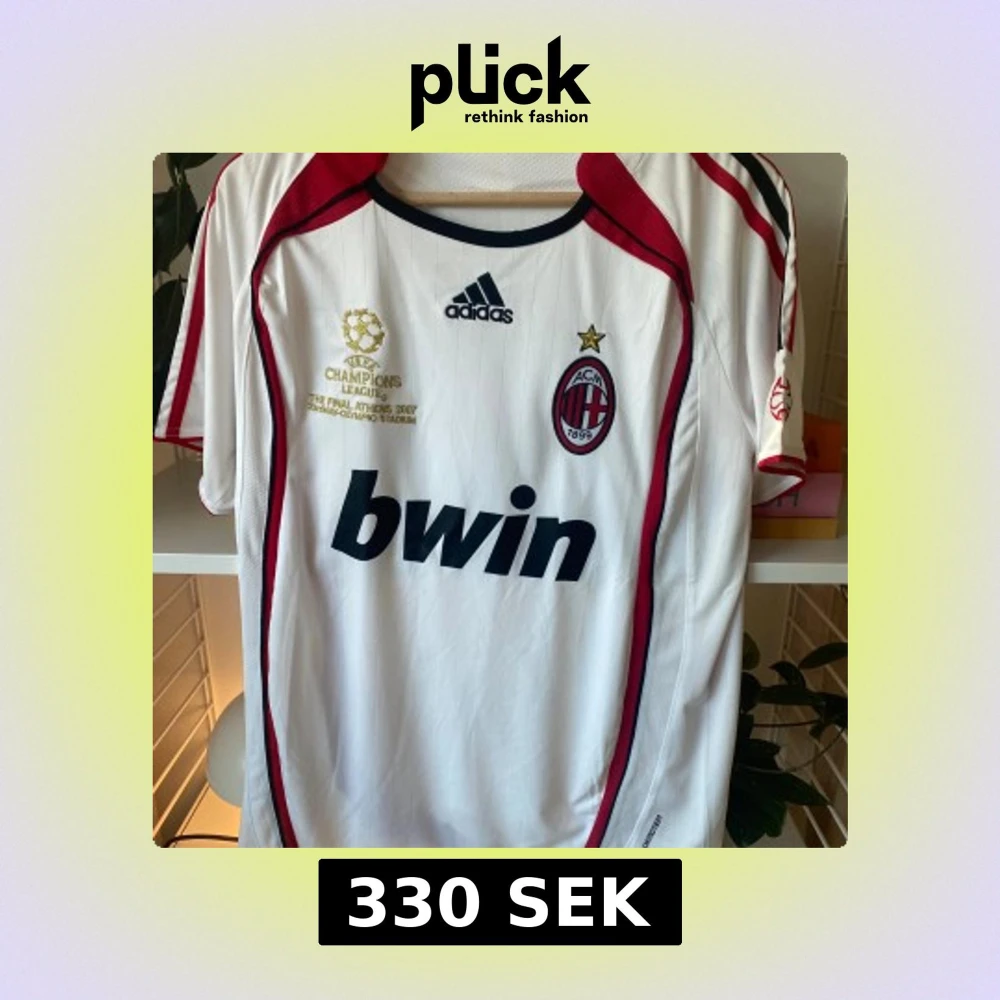 AC Milan bortatröja från Champions League-finalen 2007 i Aten. Vit med svarta och röda detaljer, broderat klubbmärke och guldtext, Adidas-logga och Bwin sponsortryck. Tillverkad i lätt polyester, klassisk passform och korta ärmar.
