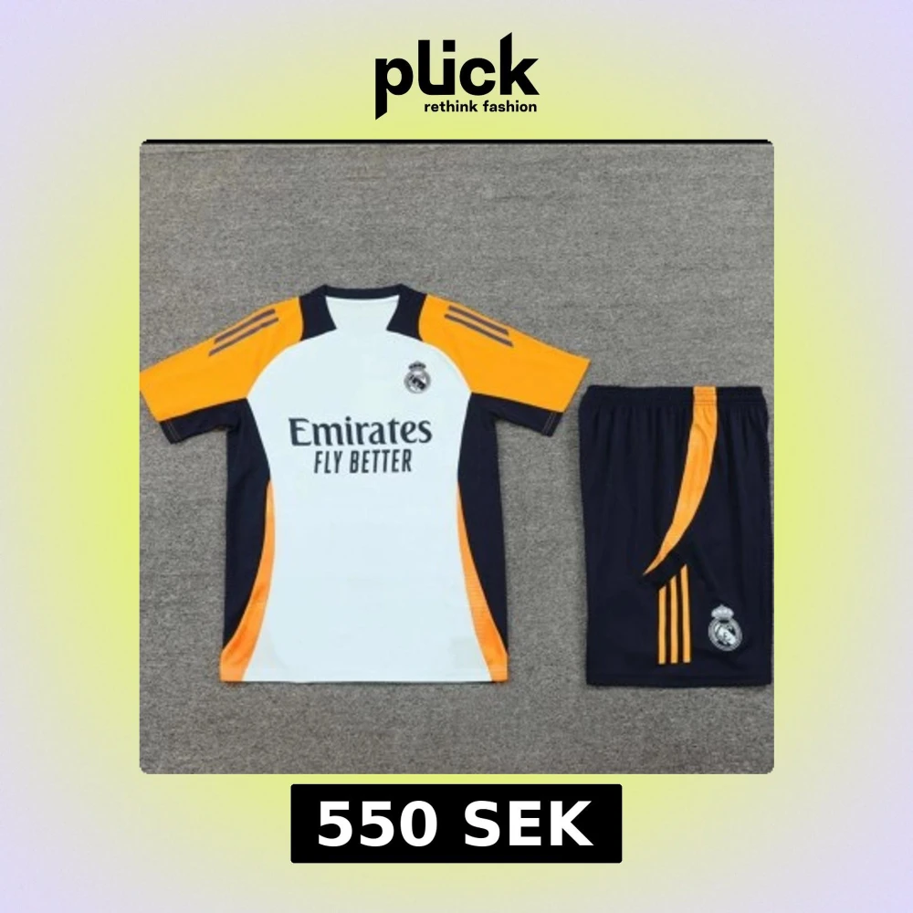 Säljer en Real Madrid fotbollströja med tillhörande shorts. Tröjan är vit med svarta och orange detaljer, kortärmad och har klubbmärke samt Adidas-logga. Materialet är lätt och andas, perfekt för träning eller match.