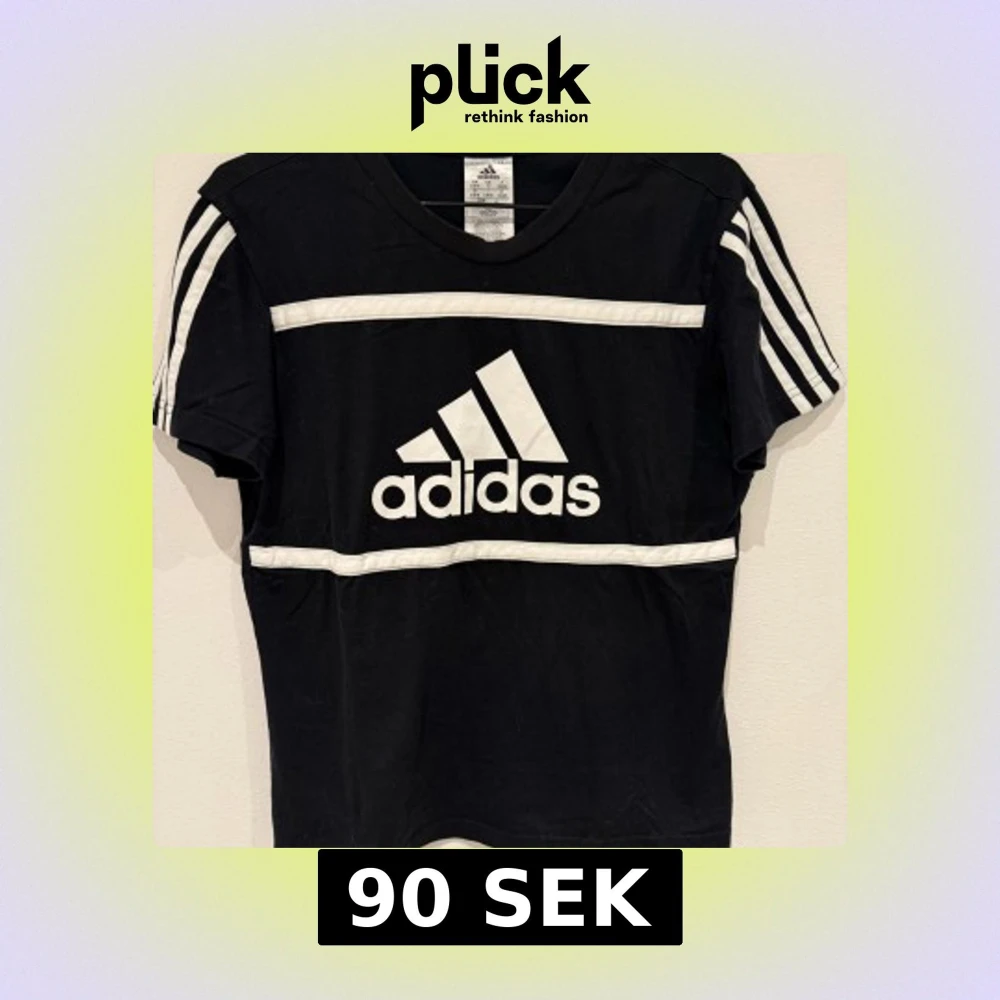 Svart t-shirt från Adidas med klassiska vita ränder på axlarna och två vita band över bröstet. Stor Adidas-logga framtill. Perfekt för en sportig look och enkel att matcha med jeans eller träningsbyxor.