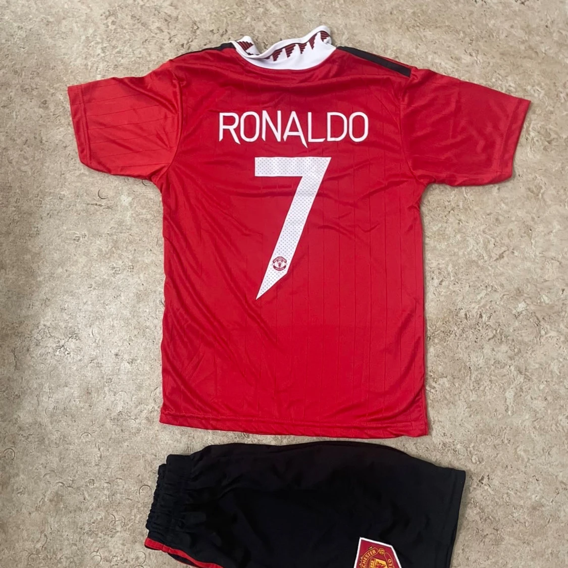 Säljer en officiell Manchester United fotbollströja från Adidas med Ronaldo 7-tryck på ryggen. Tröjan är röd med svarta detaljer och vit krage, har klubbmärke och sponsortryck på bröstet. Materialet är lätt och andas, perfekt för träning eller match.