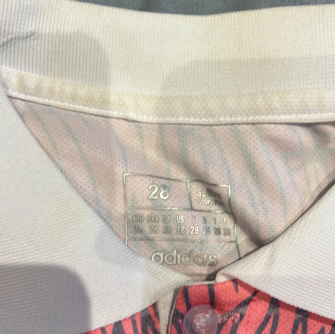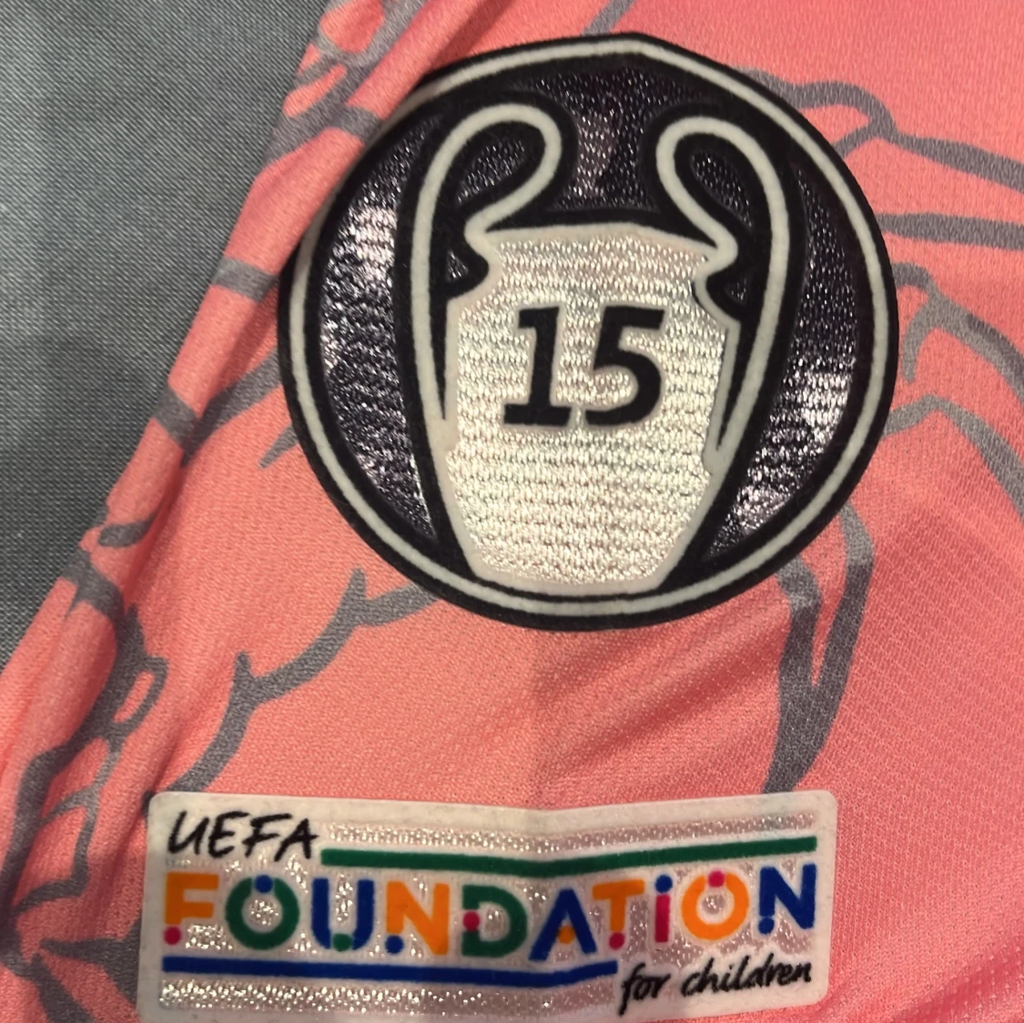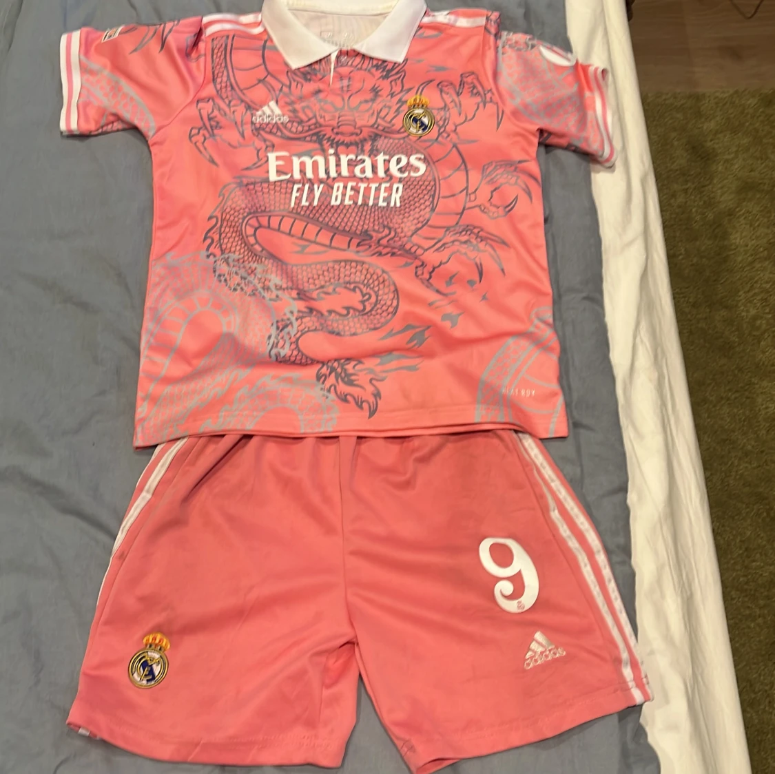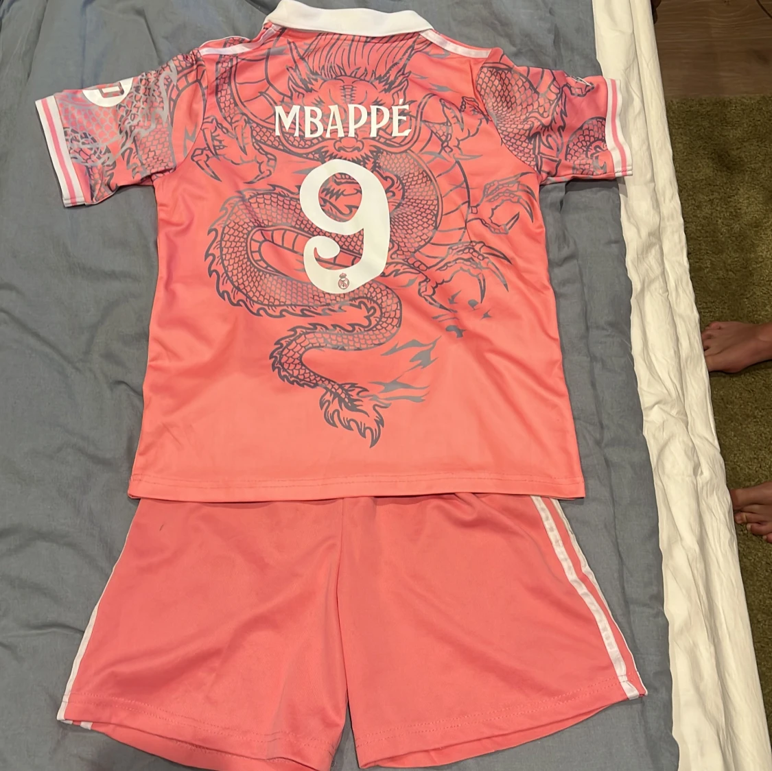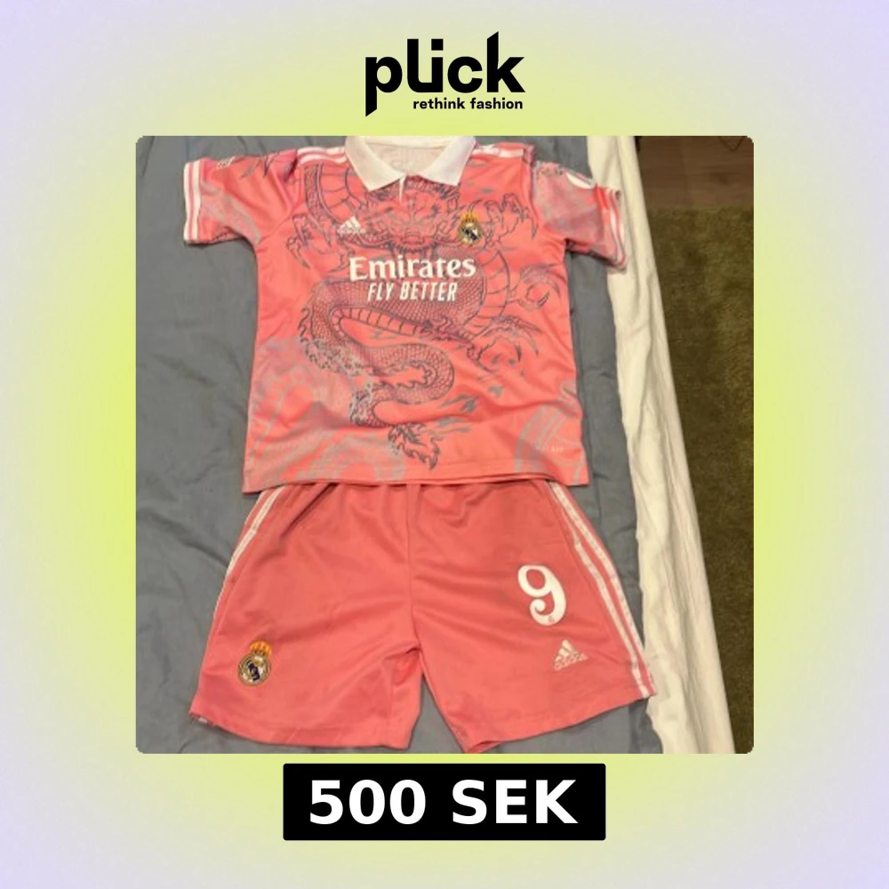 Säljer ett fett Real Madrid fotbollskit i rosa från Adidas, med Mbappé och nummer 9 på ryggen. Tröjan har korta ärmar, vit krage och drakmotiv i grått. Broderade märken, Champions League-patch och klassiska Adidas-ränder på shortsen. Materialet är lätt och andas.