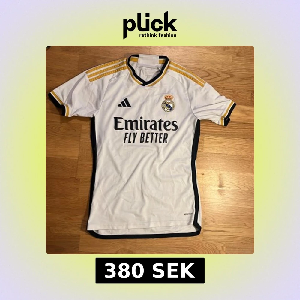 Snygg Real Madrid fotbollströja från Adidas i vit med svarta och gula detaljer, perfekt för träning eller match. Kopte den i spanien 1500kr