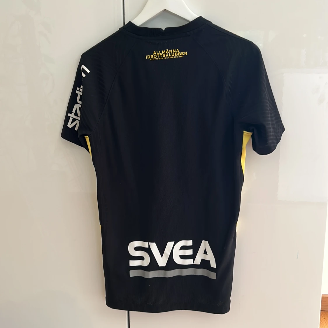 AIK:s officiella matchtröja, 130 års jubileum, svart med gula detaljer och klubbmärke på bröstet. Tillverkad i lätt och ventilerande material, med tryckta sponsorer och gula inslag längs sidorna. Perfekt för dig som vill visa ditt stöd på läktaren eller planen.