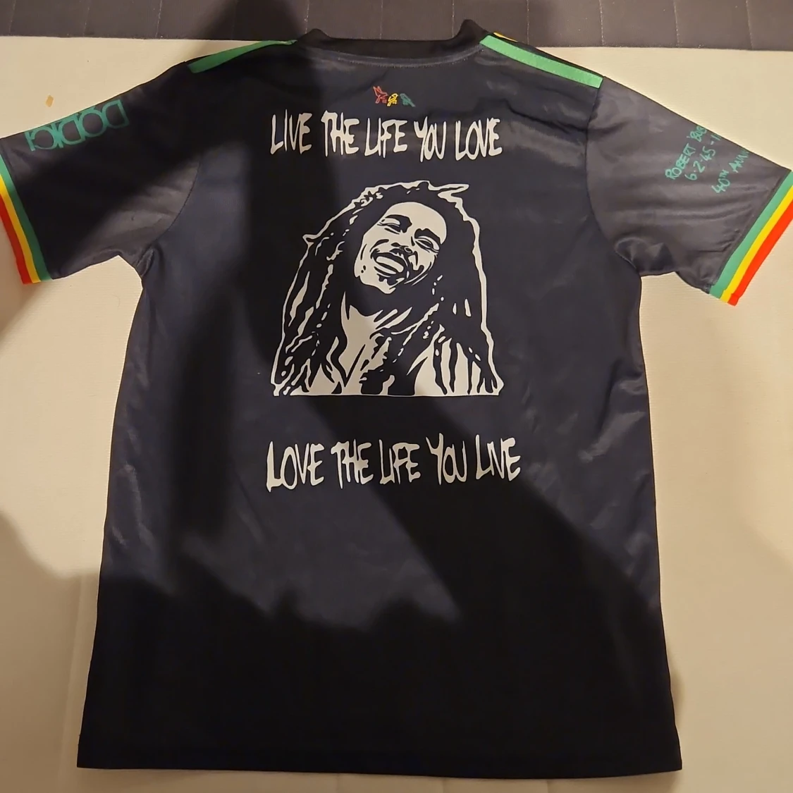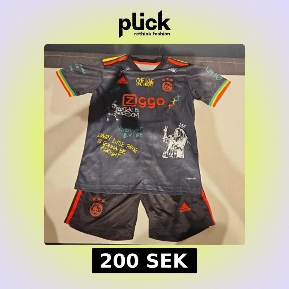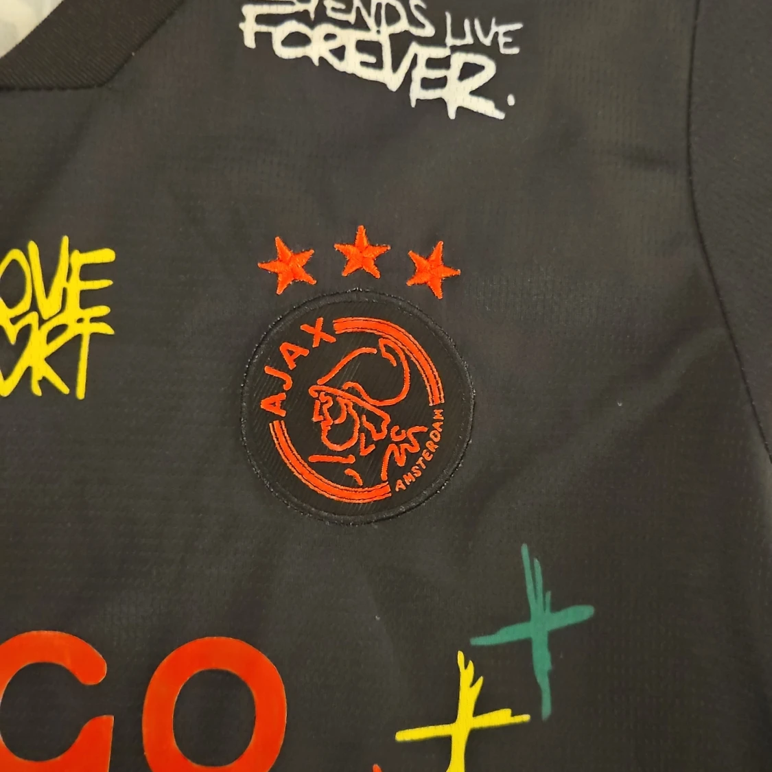 Ajax x Bob Marley limited edition fotbollströja från Adidas. Svart med färgglada detaljer i rött, gult och grönt på ärmarna, tryckta citat och illustrationer inspirerade av Bob Marley. Kortärmad, med Ajax-emblem och Ziggo sponsortryck. Material: polyester, Aeroready. Jag köpte den på en marknad i Spanien så det är en replika.