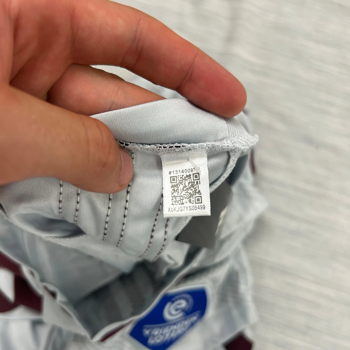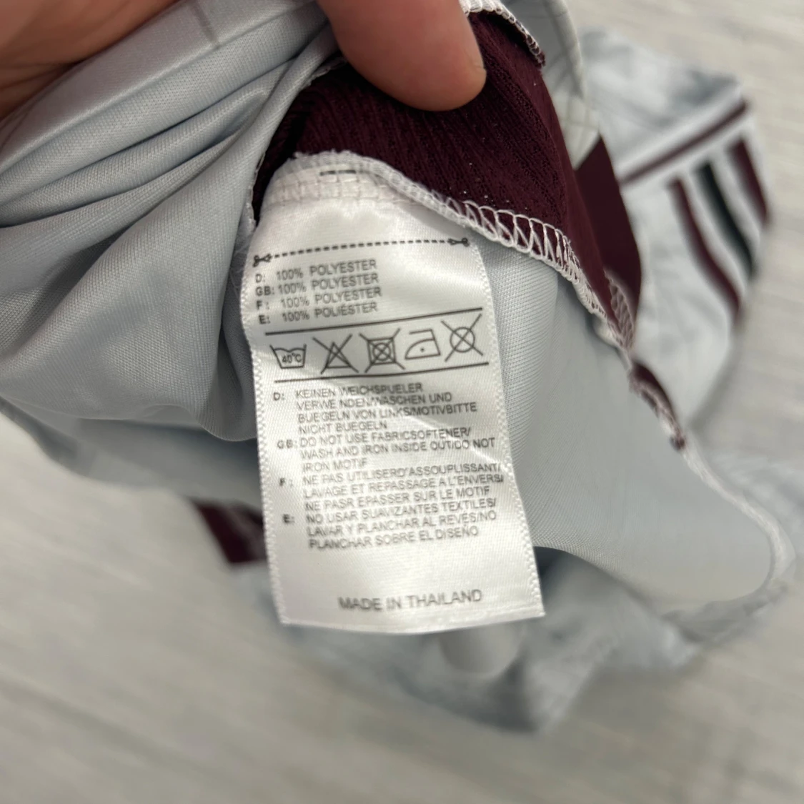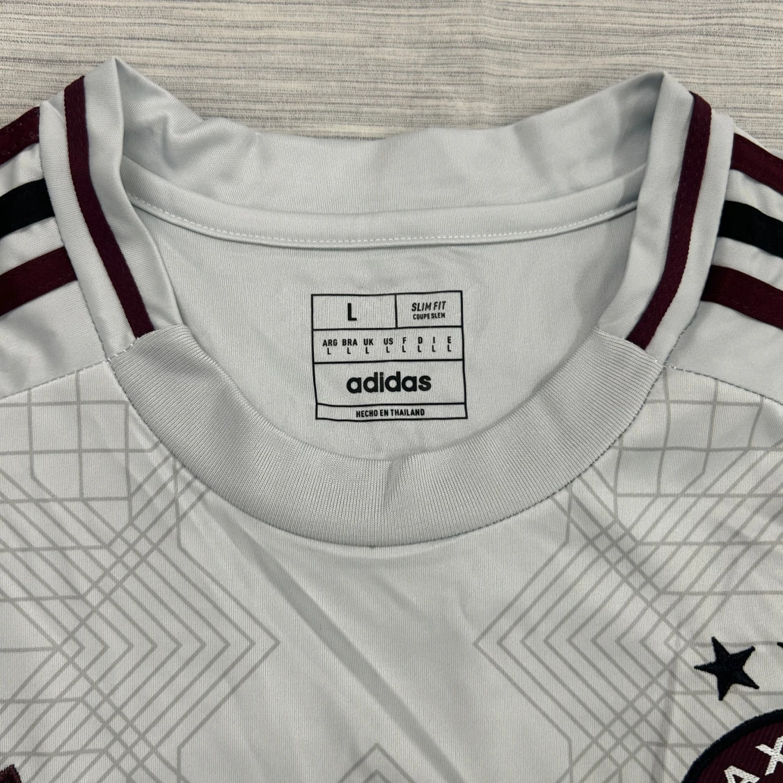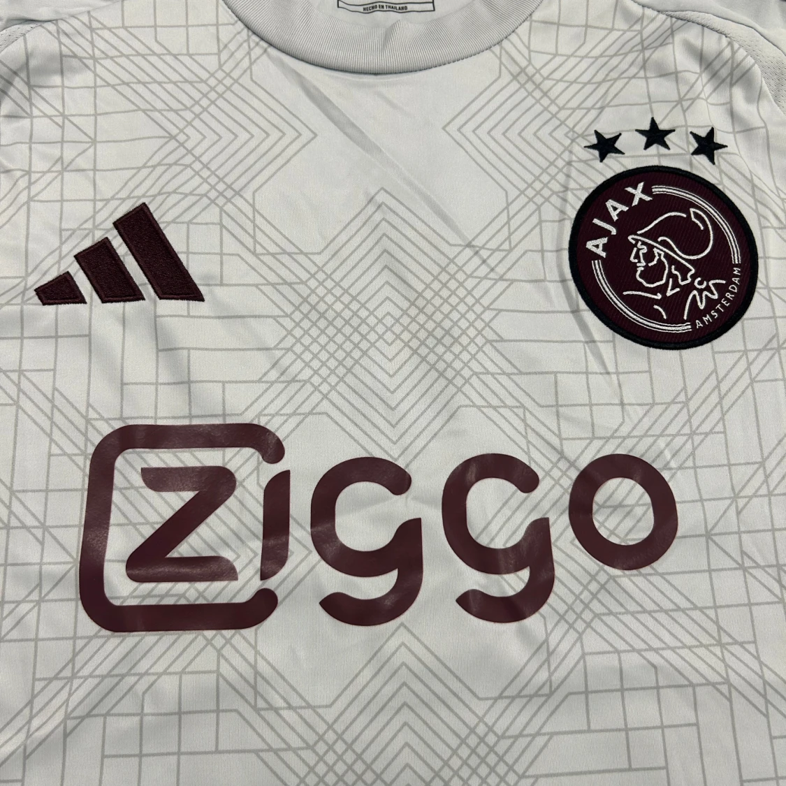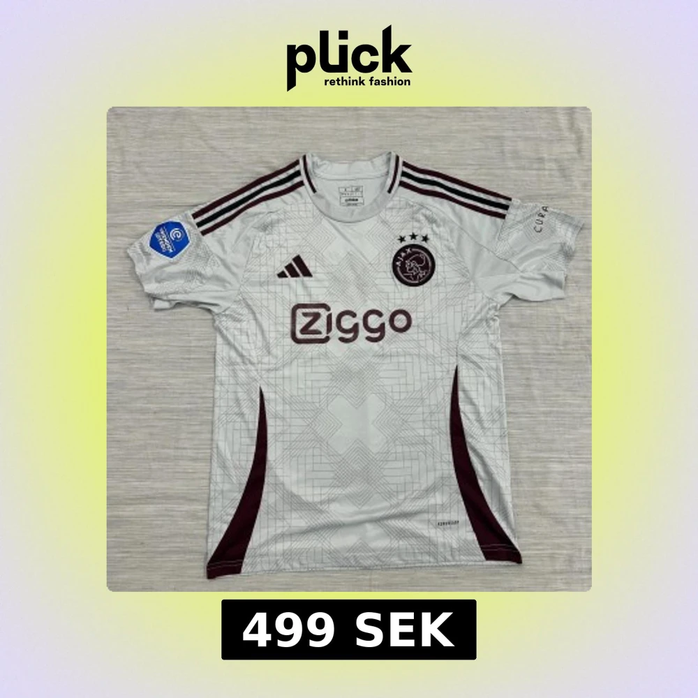 Ajax bortatröja i storlek L från Adidas. Tröjan är vit med vinröda detaljer, geometriskt mönster och klassiska Adidas-ränder på axlarna. Ajax klubbmärke och Ziggo-logga på bröstet. Tillverkad i lätt och ventilerande material (Aeroready).