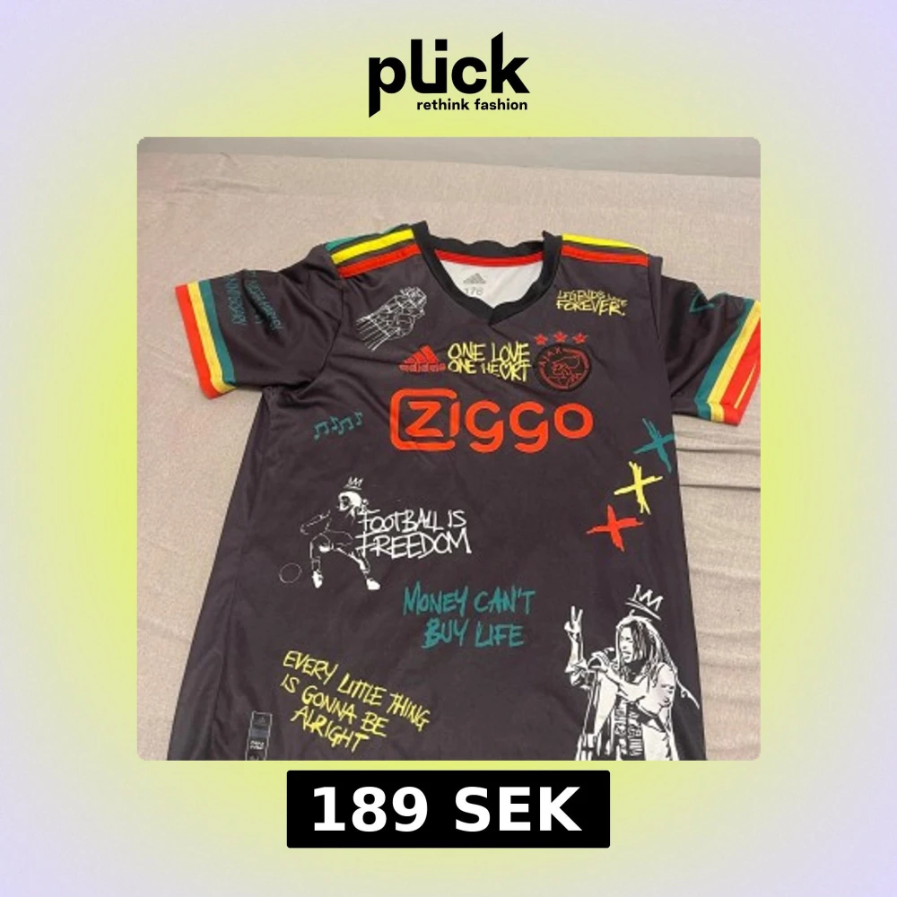 Unik svart Ajax fotbollströja från Adidas med Bob Marley-tema. Färgglada detaljer i rött, gult och grönt på ärmarna, tryck med Bob Marley, citat och graffitiliknande illustrationer. Ziggo-logga på bröstet och Ajax-märke. Tillverkad i lätt och ventilerande material.