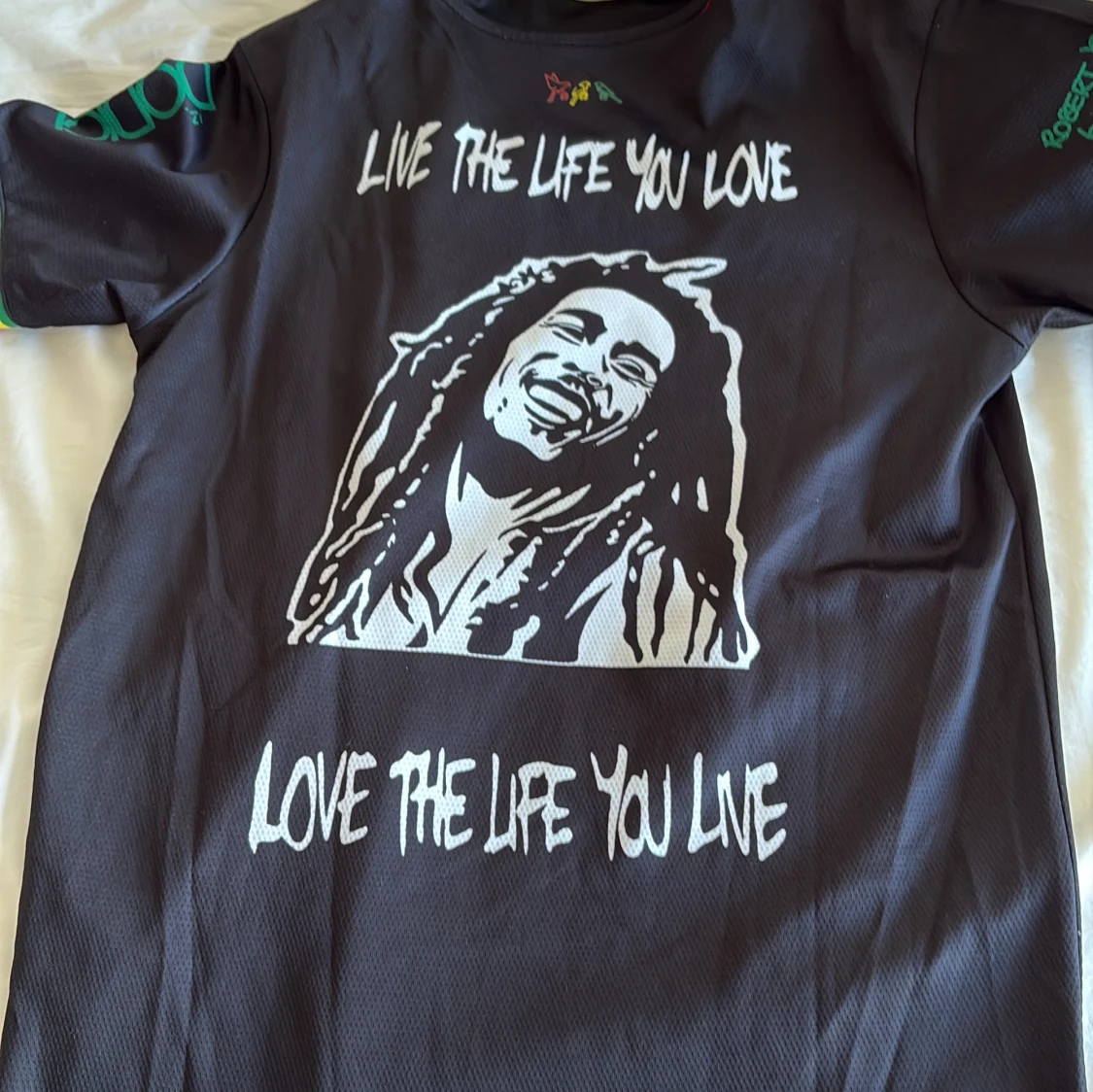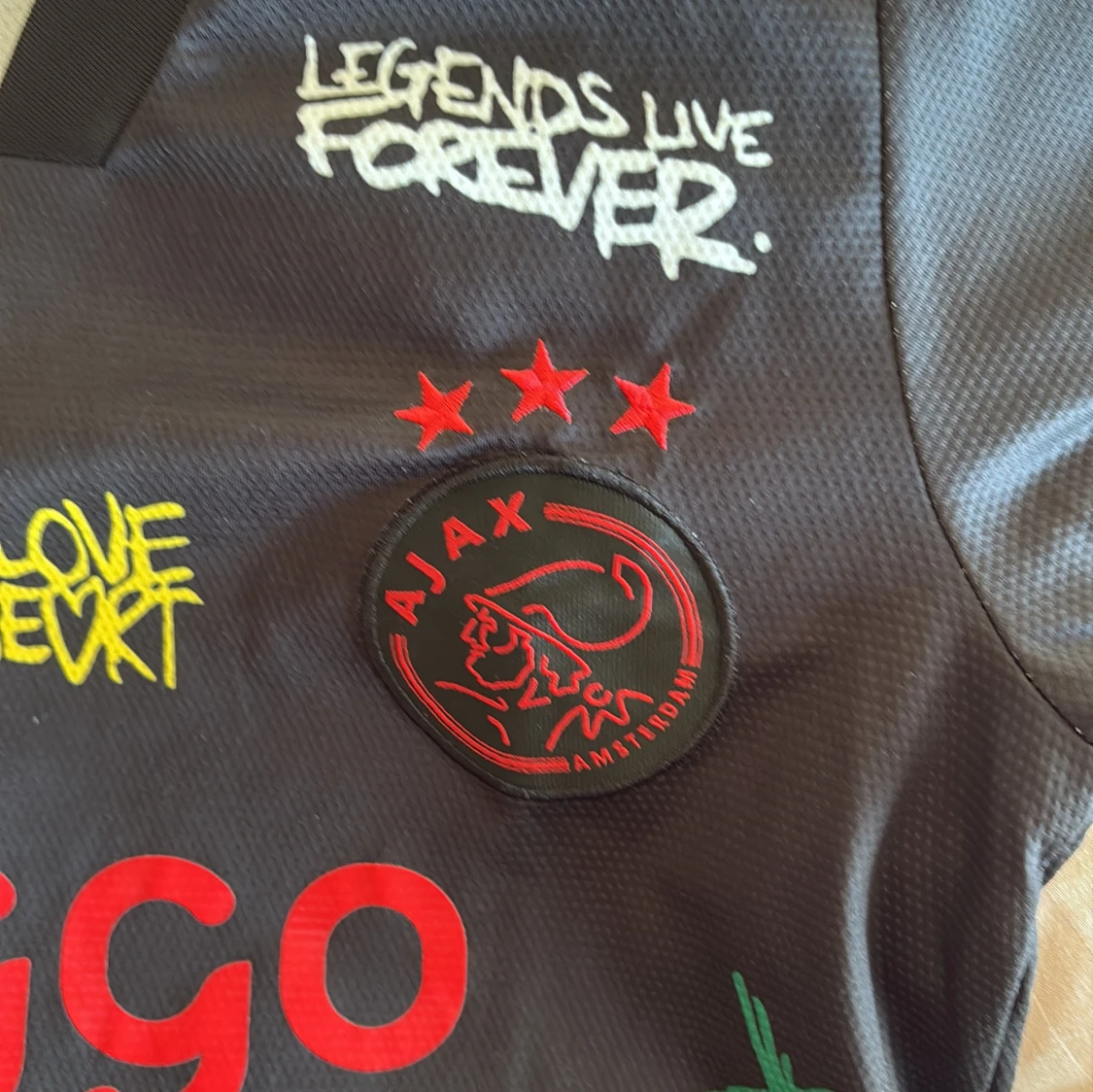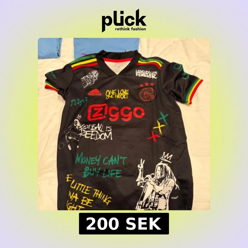 Unik svart Ajax fotbollströja från Adidas med färgglada detaljer i rött, gult och grönt. Tryck med Bob Marley, graffiti-texter och Ziggo-logga. Ajax-märke på bröstet och reggaeinspirerade ränder på axlarna. Materialet är lätt och andas, perfekt för match eller streetwear.