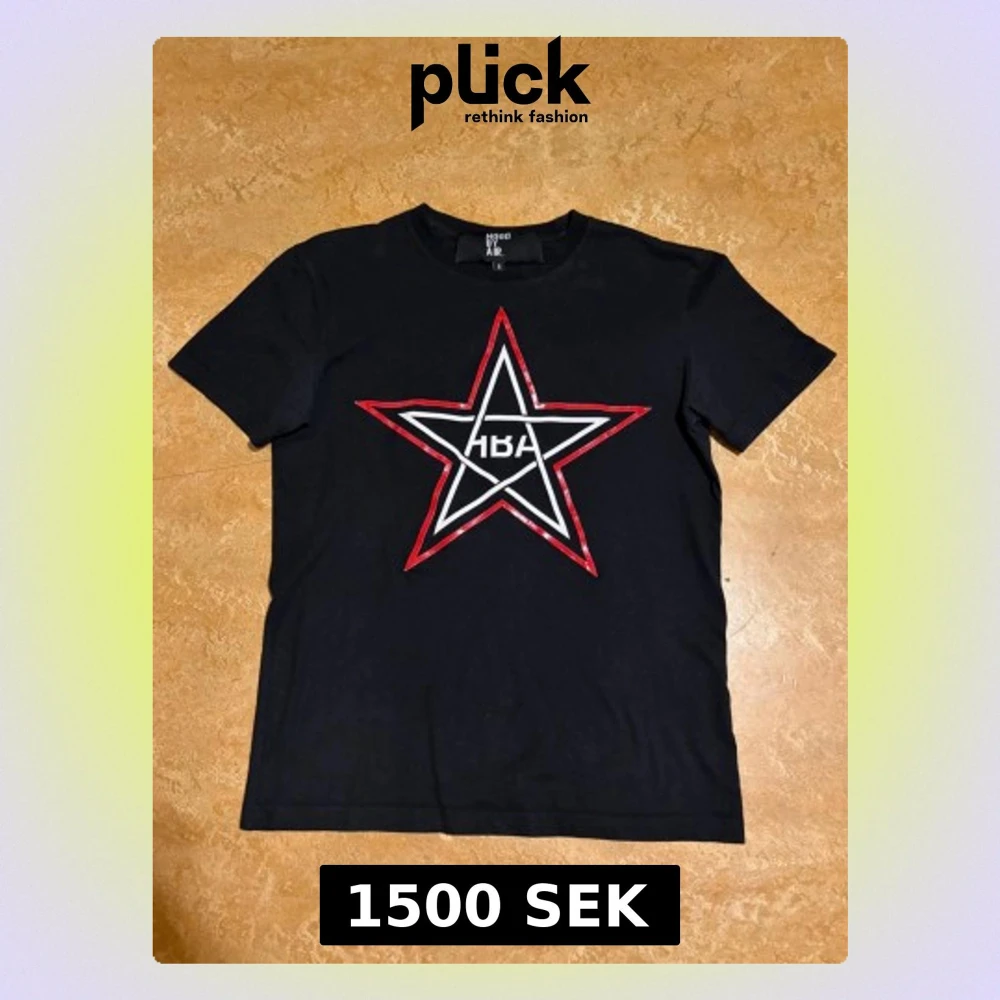 Svart t-shirt från Hood By Air med stort stjärntryck i vitt och rött på bröstet. Klassisk rund halsringning och korta ärmar. Perfekt för dig som gillar streetwear och vill sticka ut med en grafisk detalj. Köpte ganska nyss så detta är mest en intresse koll skriv gärna vid frågor/köp! Är osäker på om jag vill sälja så pris får diskuteras privat! Btw jag är 188cm som referens