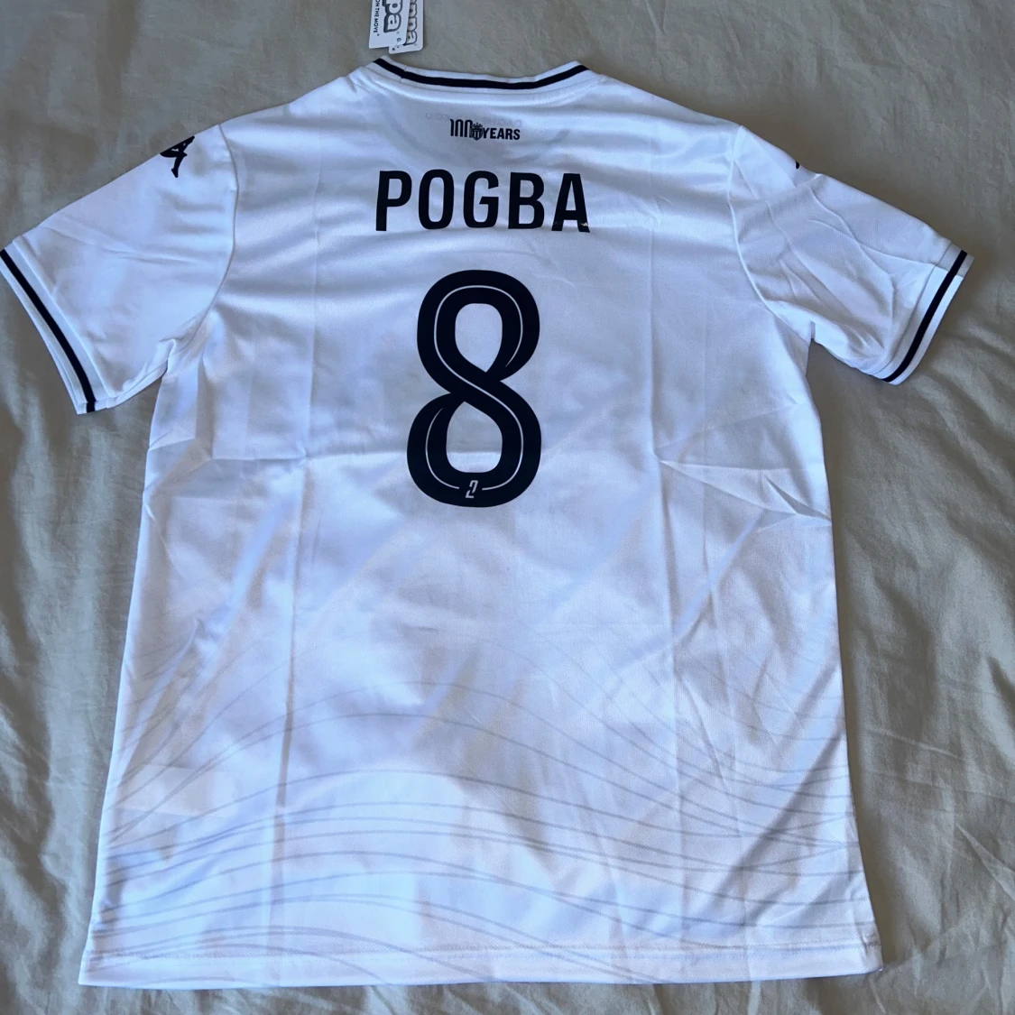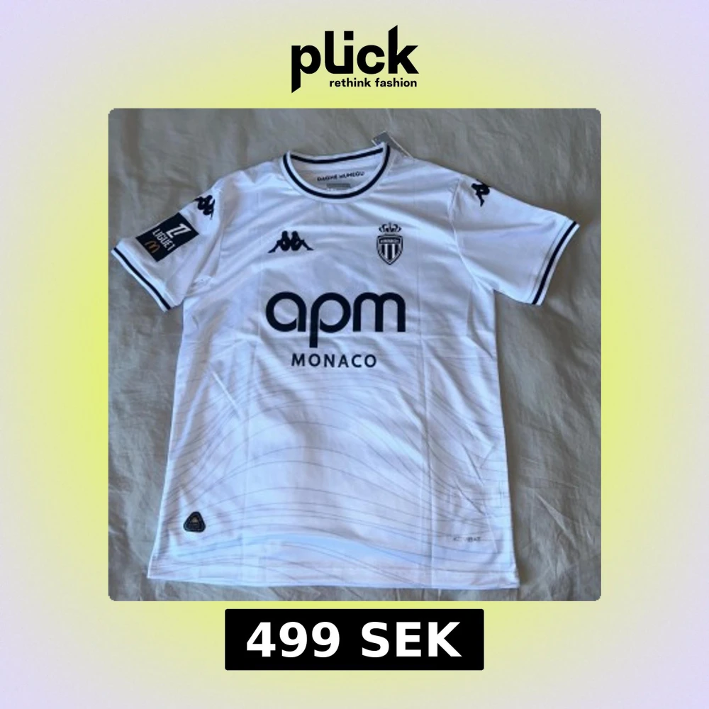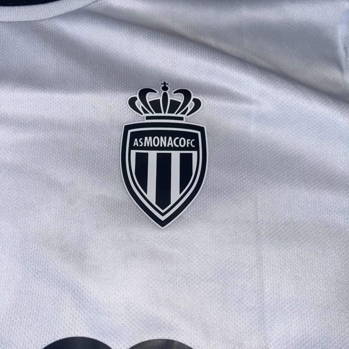 AS Monaco fotbollströja i vitt med svarta detaljer, Pogba och nummer 8 på ryggen. Kappa-logga på axlarna, klubbmärke på bröstet och Ligue 1-märke på ärmen. Tillverkad i lätt och ventilerande polyester, perfekt för match eller träning.